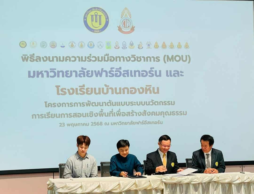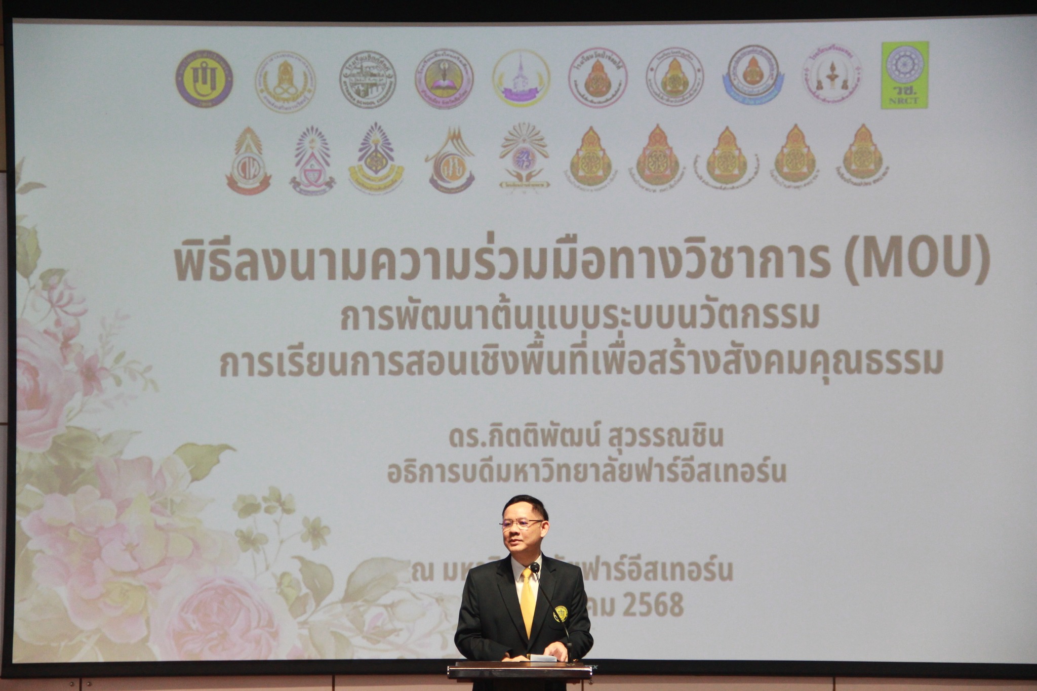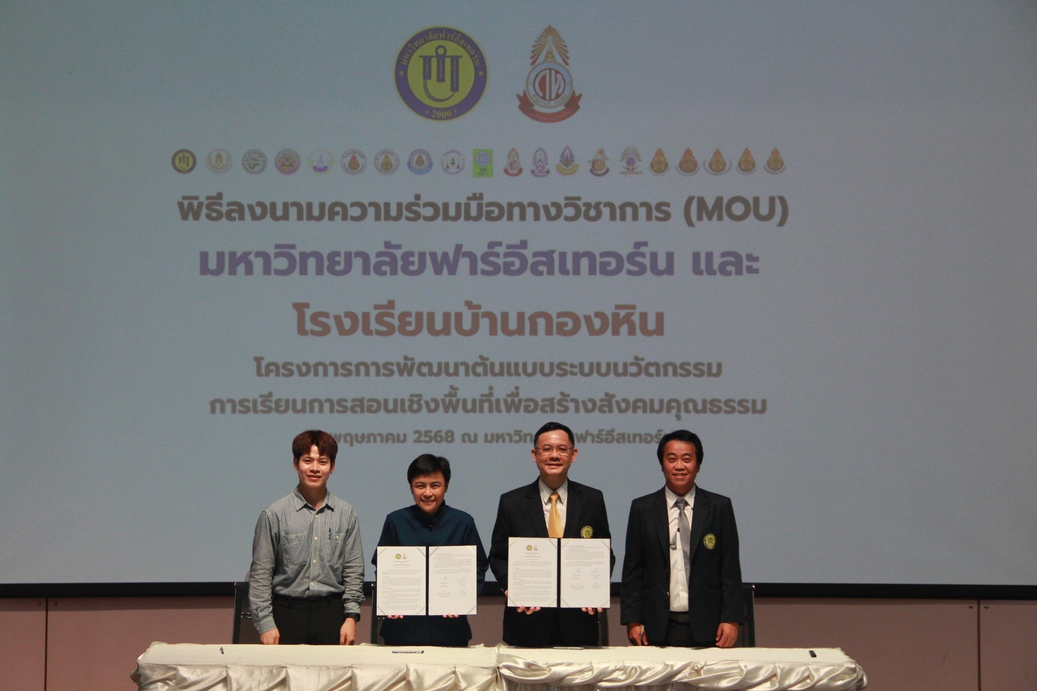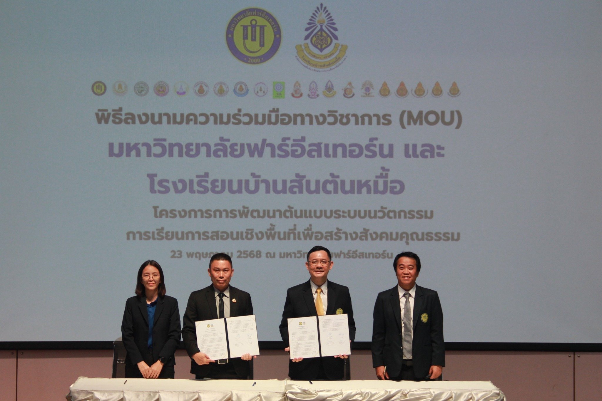 ดร.กิตติพัฒน์ สุวรรณชิน อธิการบดีมหาวิทยาลัยฟาร์อีสเทอร์น นำทีมนักวิจัยมหาวิทยาลัยฟาร์อีสเทอร์น ลงนามบันทึกข้อตกลงความร่วมมือ (MOU) กับ 24 สถานศึกษาในจังหวัดเชียงใหม่ ภายใต้โครงการวิจัย “การพัฒนาต้นแบบระบบนวัตกรรมการเรียนการสอนเชิงพื้นที่เพื่อสร้างสังคมคุณธรรม” โดยได้รับทุนสนับสนุนการวิจัยจากสำนักงานการวิจัยแห่งชาติ (วช.)