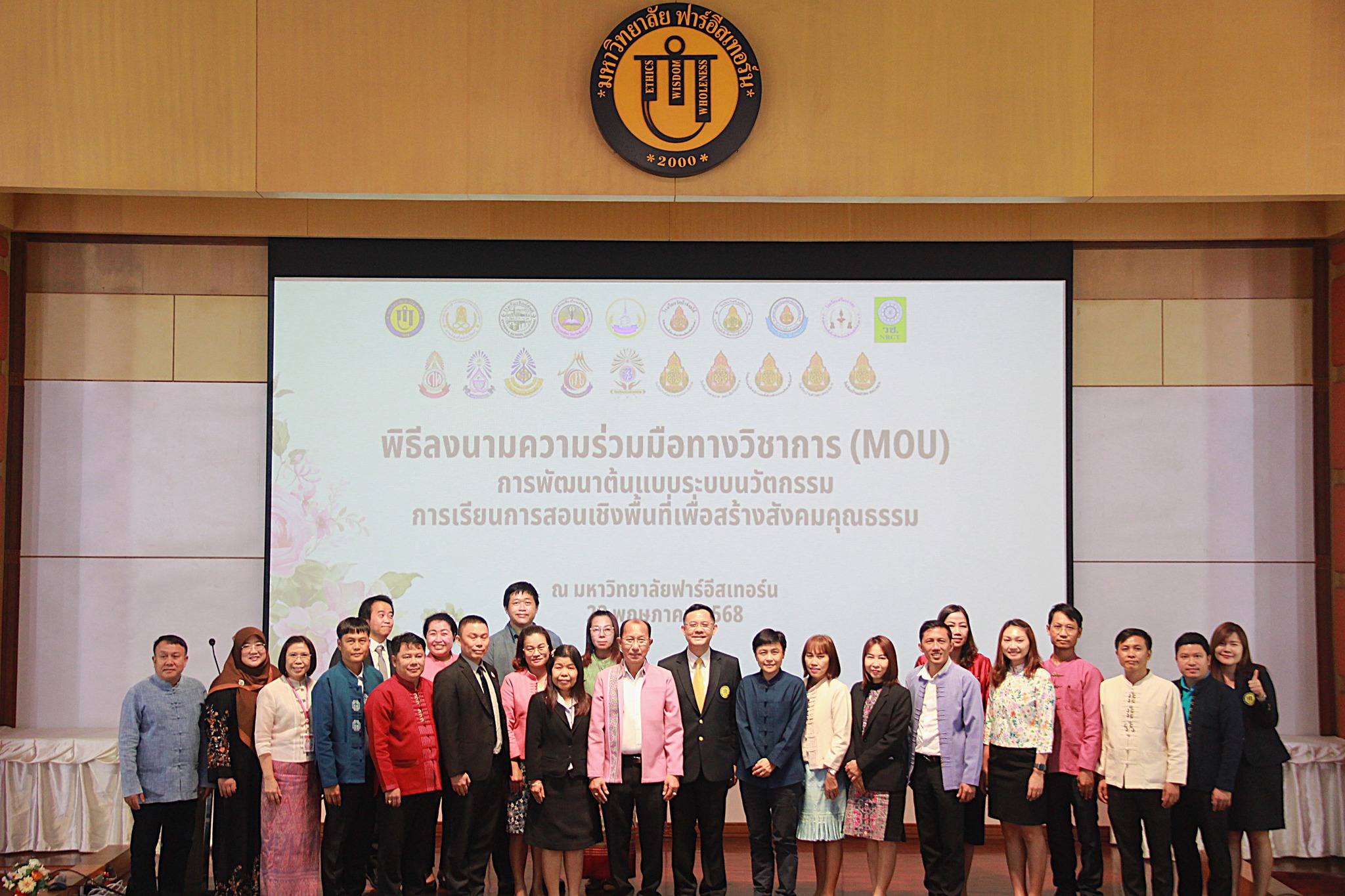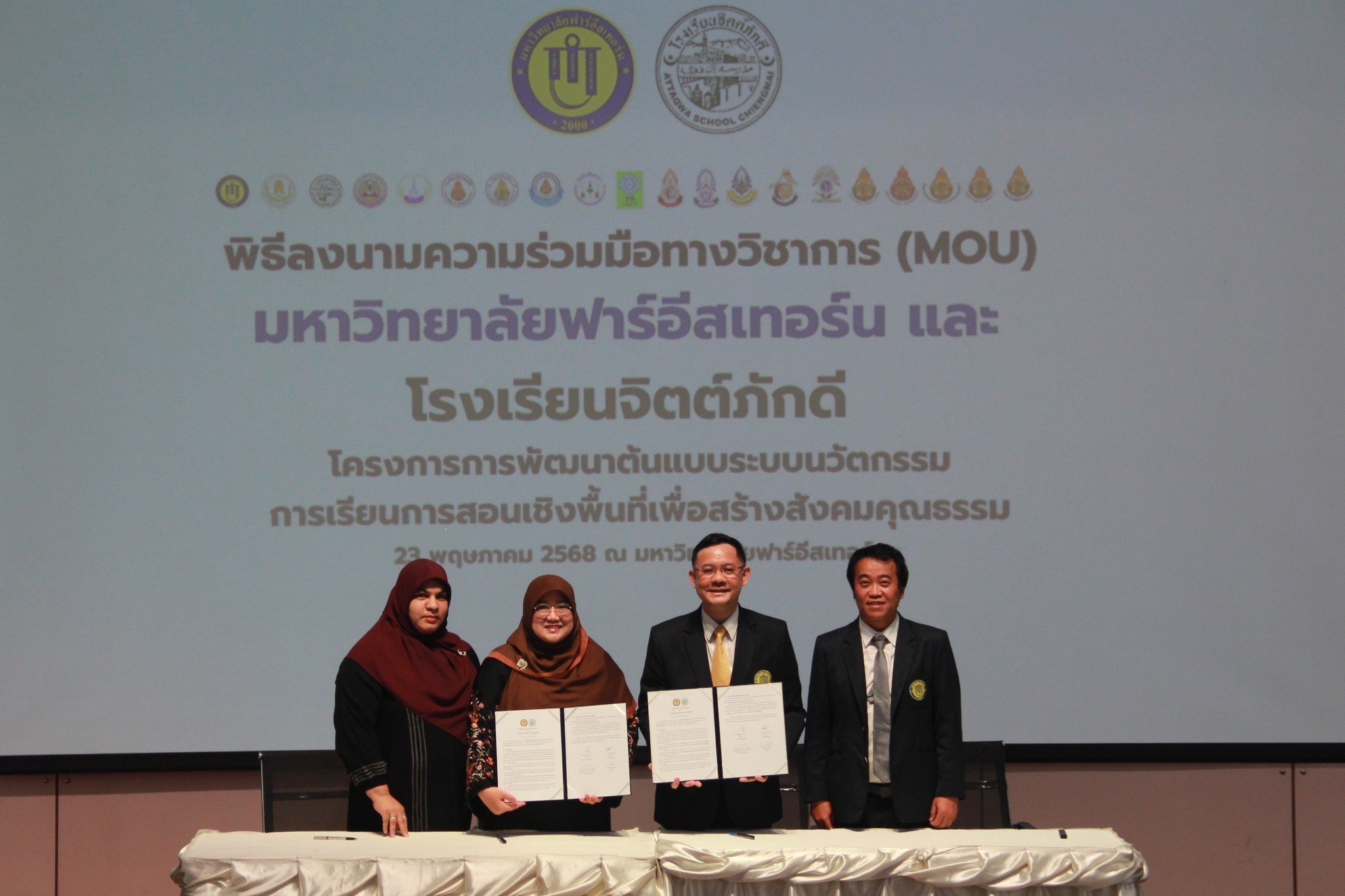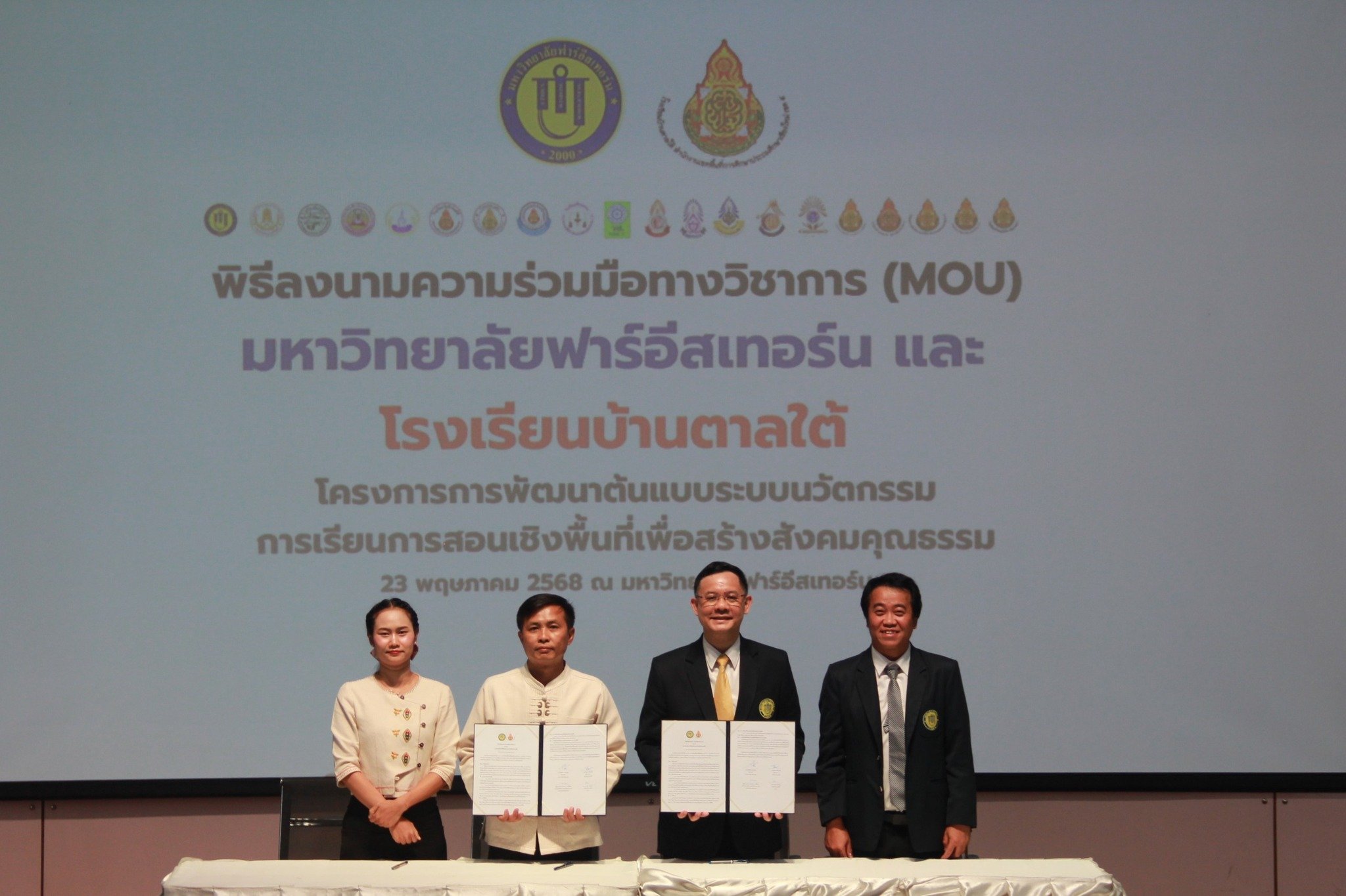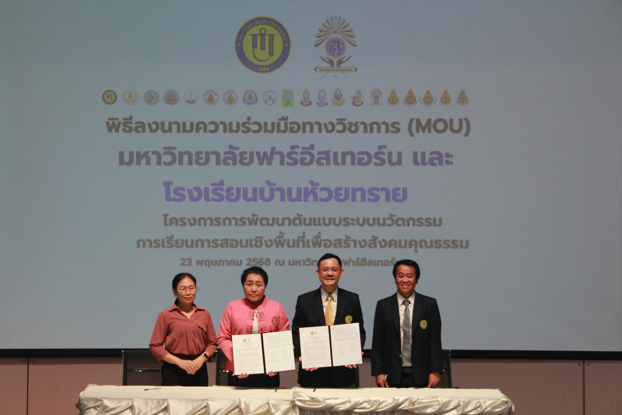 ดร.กิตติพัฒน์ สุวรรณชิน อธิการบดีมหาวิทยาลัยฟาร์อีสเทอร์น นำทีมนักวิจัยมหาวิทยาลัยฟาร์อีสเทอร์น ลงนามบันทึกข้อตกลงความร่วมมือ (MOU) กับ 24 สถานศึกษาในจังหวัดเชียงใหม่ ภายใต้โครงการวิจัย “การพัฒนาต้นแบบระบบนวัตกรรมการเรียนการสอนเชิงพื้นที่เพื่อสร้างสังคมคุณธรรม” โดยได้รับทุนสนับสนุนการวิจัยจากสำนักงานการวิจัยแห่งชาติ (วช.)