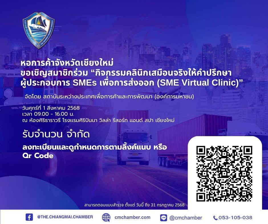 📢📢 หอการค้าจังหวัดเชียงใหม่ ขอเชิญสมาชิกร่วม “กิจกรรมคลินิกเสมือนจริงให้คำปรึกษาผู้ประกอบการ SMEs เพื่อการส่งออก (SME Virtual Clinic)”