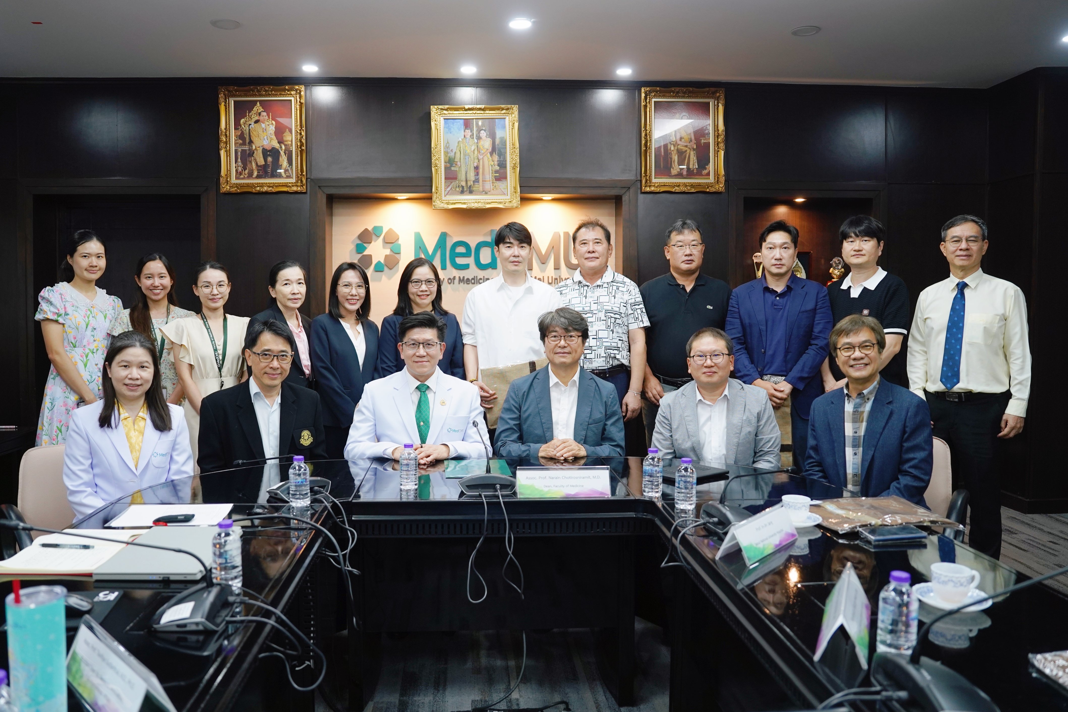 รศ.นพ.นเรนทร์ โชติรสนิรมิต คณบดีคณะแพทยศาสตร์ มช พร้อมด้วย ศ.ดร.นพ.ดำเนินสันต์ พฤกษากร รองคณบดีด้านวิจัย นวัตกรรม และวิเทศสัมพันธ์, รศ.ดร.พญ.ทวิติยา สุจริตรักษ์ ผู้ช่วยคณบดีด้านวิจัย นวัตกรรม และวิเทศสัมพันธ์, รศ.นพ.ประพันธ์ จุฑาวิจิตรธรรม หัวหน้าศูนย์ความร่วมมือทางการวิจัย ไทย-เกาหลี