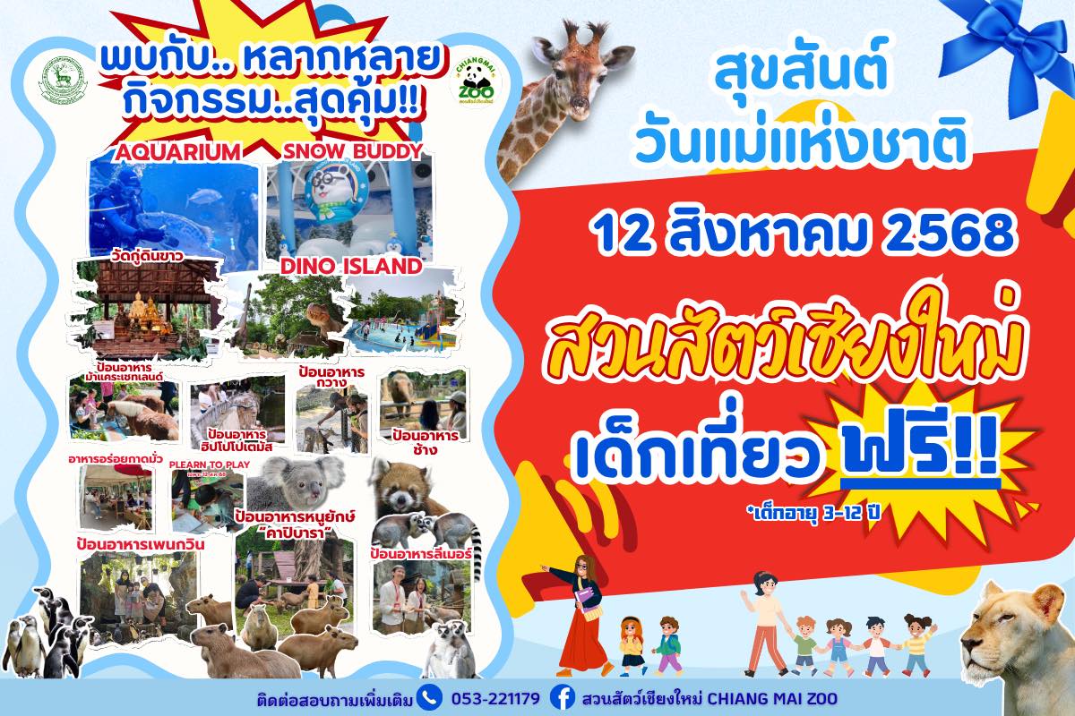 ในส่วนของสวนสัตว์เชียงใหม่ เชิญชวนนักท่องเที่ยวร่วมเฉลิมฉลองวันแม่แห่งชาติ ด้วยสิทธิพิเศษสำหรับน้อง ๆ เด็กอายุไม่เกิน 12 ปี เข้าชมสวนสัตว์ฟรี! พร้อมกิจกรรมสุดพิเศษ “ป้อนอาหารหนูยักษ์คาปิบารา” ในระหว่างวันที่ 9 – 12 สิงหาคม 2568 สัมผัสความน่ารักของสัตว์ฟันแทะขนาดใหญ่ที่สุดในโลกอย่างใกล้ชิด โดยมี “พ่อเบิ้ม” หัวหน้าแก๊งคาปิบารา นำทีมมาสร้างรอยยิ้ม และความประทับใจให้กับนักท่องเที่ยวภายในบรรยากาศอบอุ่นของสวนสัตว์ กิจกรรมนี้จัดวันละ 2 รอบ รอบละ 20 ชุด คือ เวลา 10.00–12.00 น. และ 13.00–15.00 น. เพื่อให้สัตว์ได้รับอาหารในปริมาณที่เหมาะสมพร้อมมอบประสบการณ์ที่เป็นส่วนตัวและปลอดภัย โดยมีเจ้าหน้าที่ดูแลอย่างใกล้ชิดภายใต้มาตรการแบบ Executive นอกจากนี้ยังมีกิจกรรม “ทำดีเพื่อแม่” ขอเชิญชวนร่วมบริจาคหน้ากากอนามัยสีดำ และสเปรย์แอลกอฮอล์ เพื่อนำไปมอบให้แก่ทหารที่ปฏิบัติหน้าที่ ณ ชายแดนไทย–กัมพูชา เป็นกำลังใจเล็กๆ ที่ยิ่งใหญ่จากประชาชนสู่ผู้เสียสละเพื่อชาติ