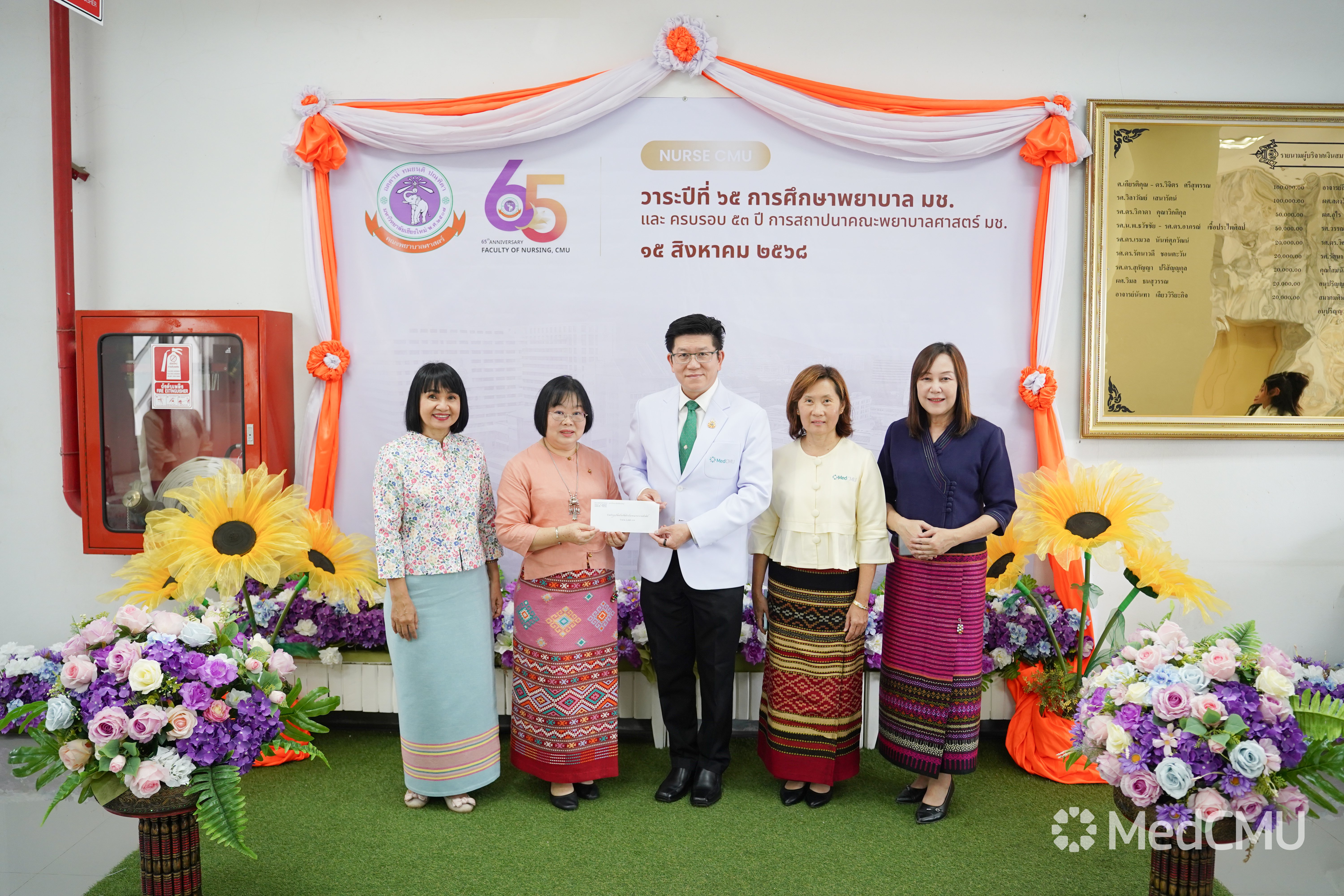 รศ.นพ.นเรนทร์ โชติรสนิรมิต คณบดีคณะแพทยศาสตร์ มช. พร้อมด้วย คุณมะลิวรรณ หินทอง เลขานุการคณะแพทยศาสตร์ มช. และ คุณอรวรรณ เร่งเร็ว หัวหน้างานบริหารทั่วไป ร่วมแสดงความยินดี ในโอกาสวันคล้ายวันสถาปนาคณะพยาบาลศาสตร์ มหาวิทยาลัยเชียงใหม่ ครบรอบ 53 ปี และ วาระครบรอบ 65 ปี การศึกษาพยาบาล มช.