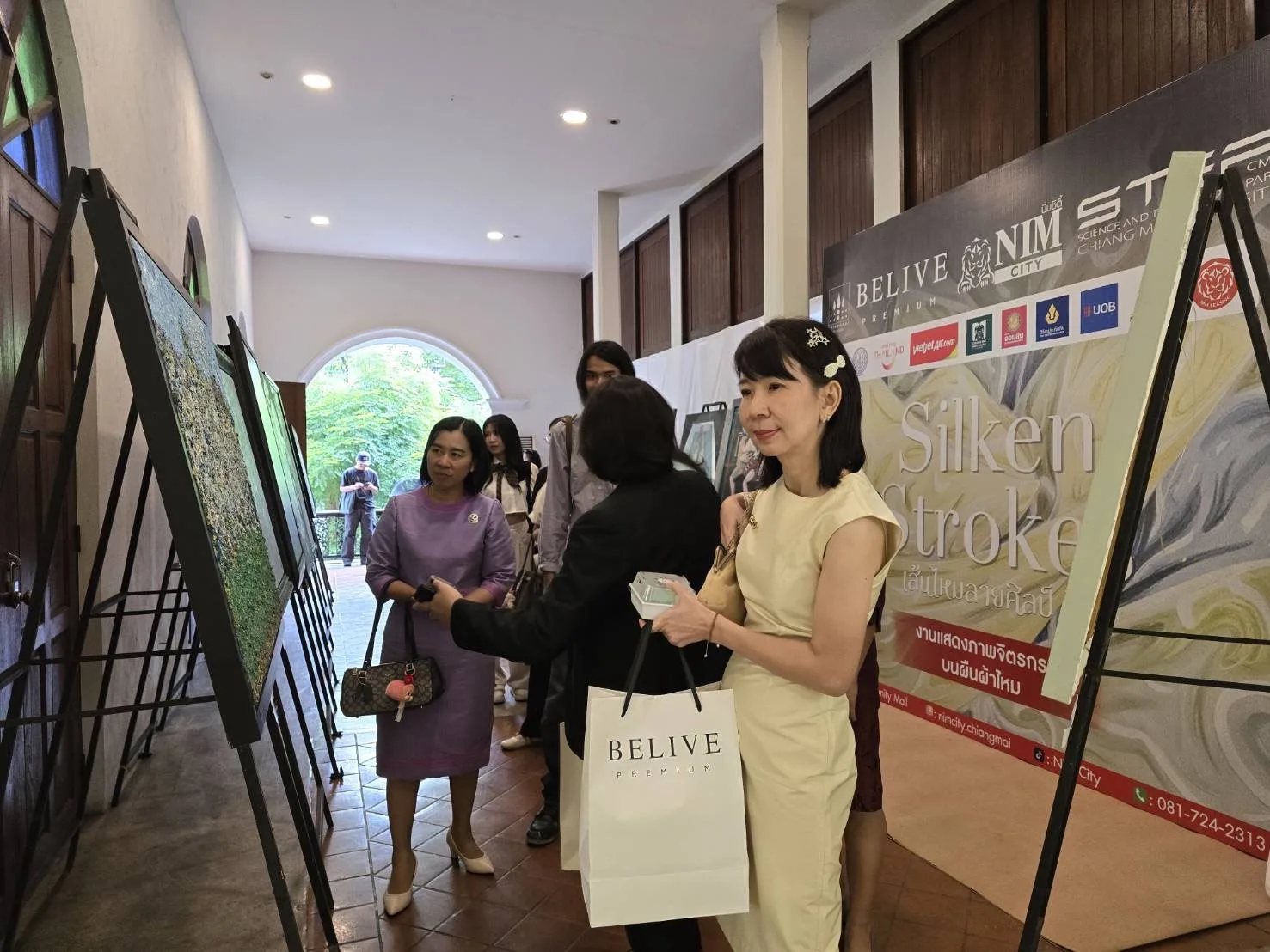 การแสดงภาพจิตรกรรมบนผืนผ้าไหม เป็นภาพเขียนคอลเลคชั่นพิเศษของศิลปินชั้นนำ จากพิพิธภัณฑ์ศิลปะเชียงใหม่ บน Hand Woven Silk Canvas ผืนผ้าไหมทอมือของแบรนด์ Belive Premium ซึ่งเป็นผ้าไหมตรานกยูงพระราชทานสั่งทอพิเศษจากทัณฑสถานหญิงเชียงใหม่ ซึ่งได้รับการสนับสนุนจากศูนย์หม่อนไหมเฉลิมพระเกียรติฯ เชียงใหม่ แล้วนำมาสร้างเป็นภาพจิตรกรรมชั้นเลิศจากปลายภู่กันของศิลปินจากพิพิธภัณฑ์ศิลปะเชียงใหม่กว่า 10 ชีวิต นับเป็นการคอลแลบศิลปะ 2 แขนงด้วยกัน