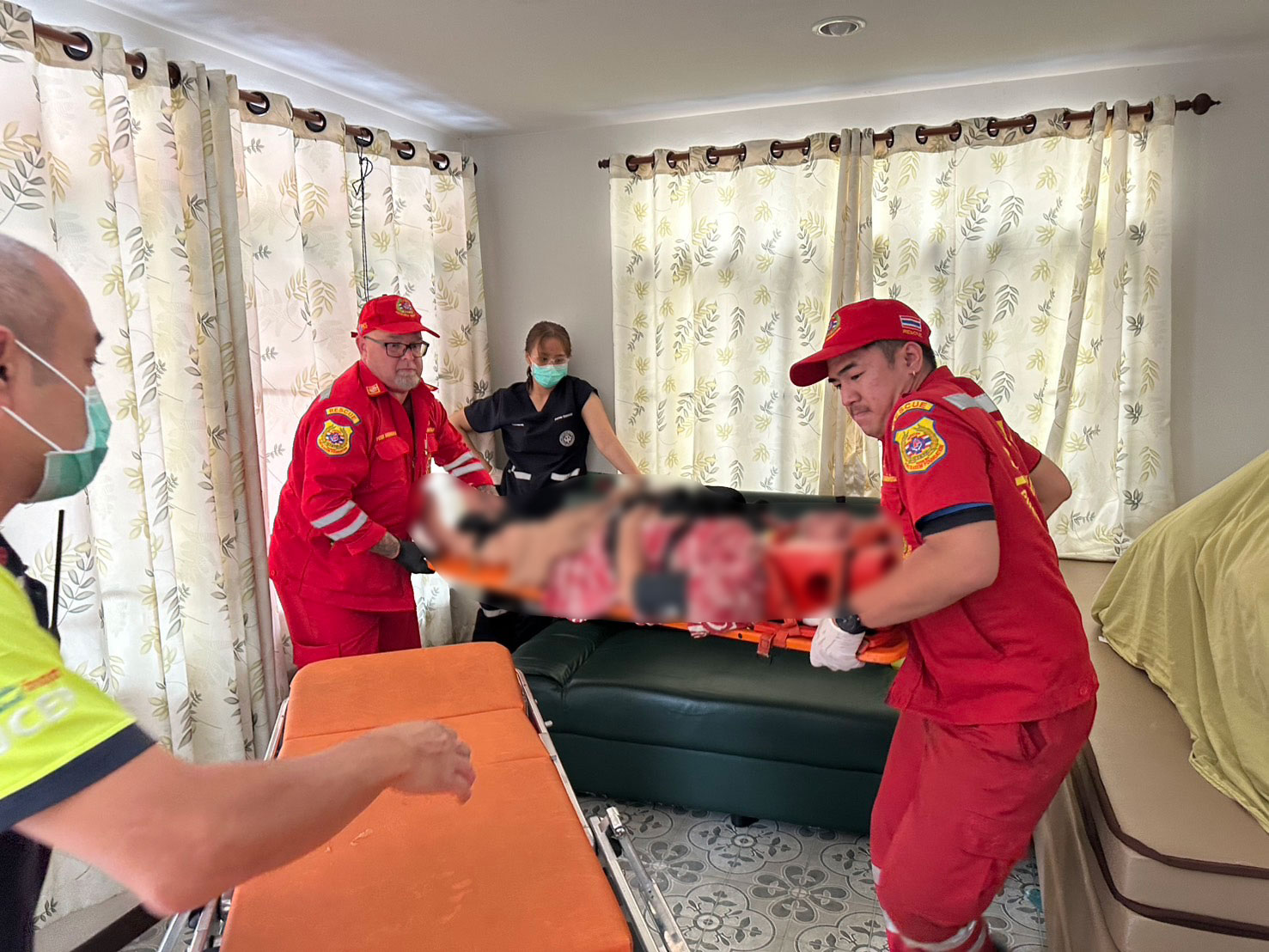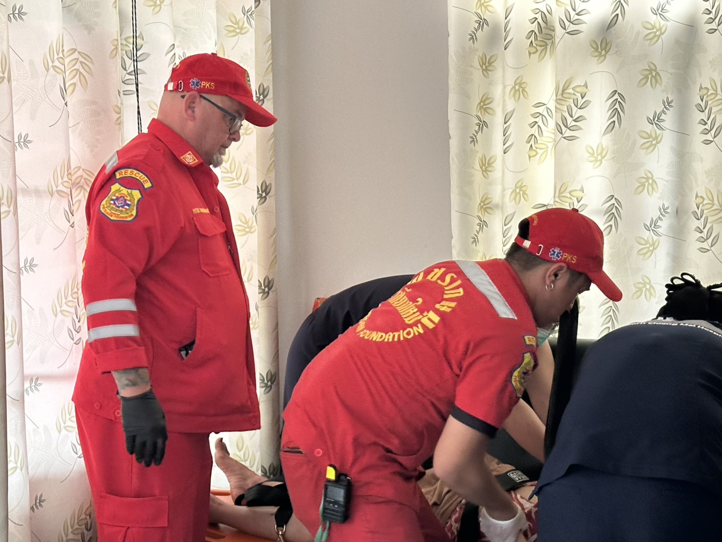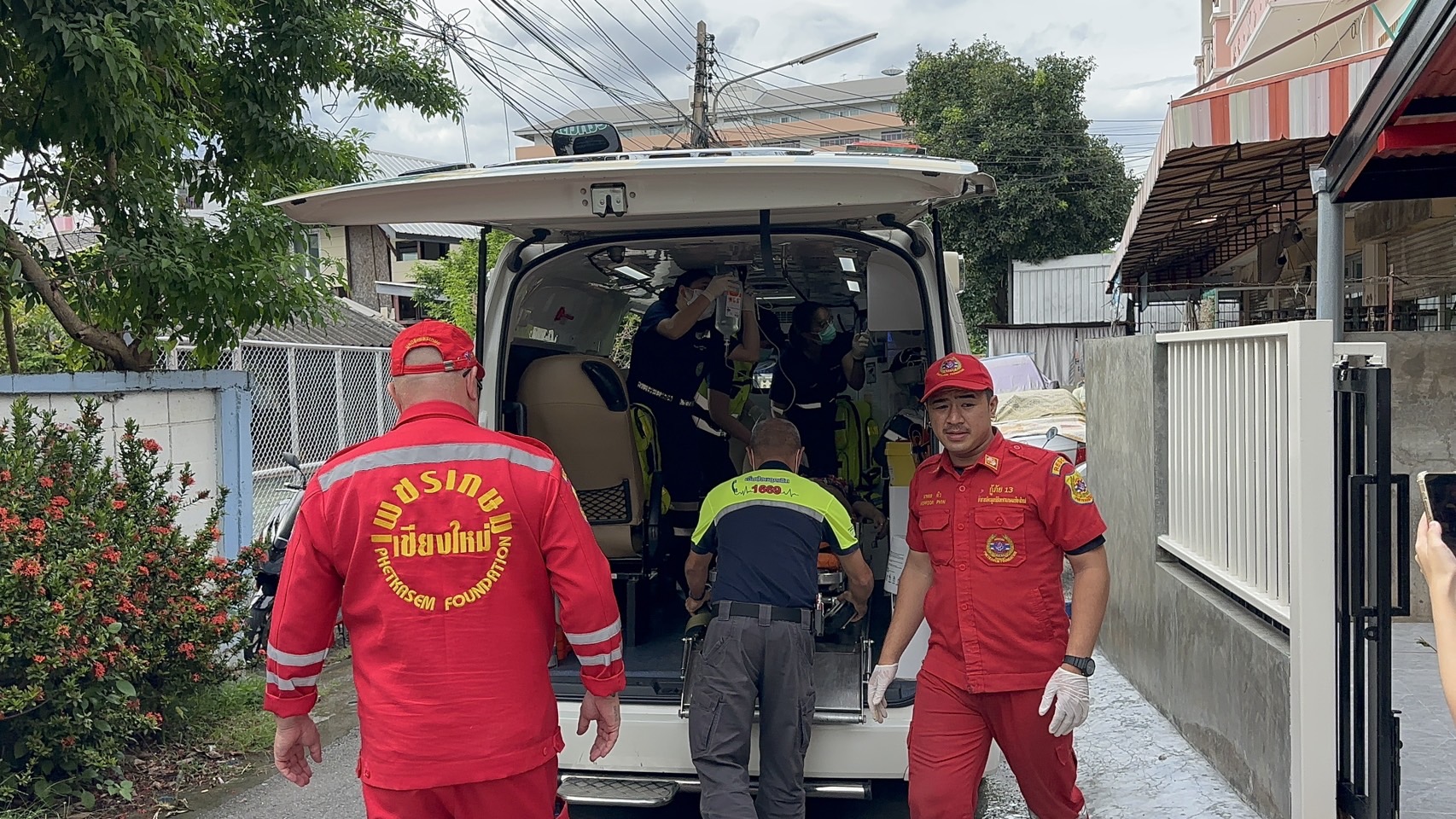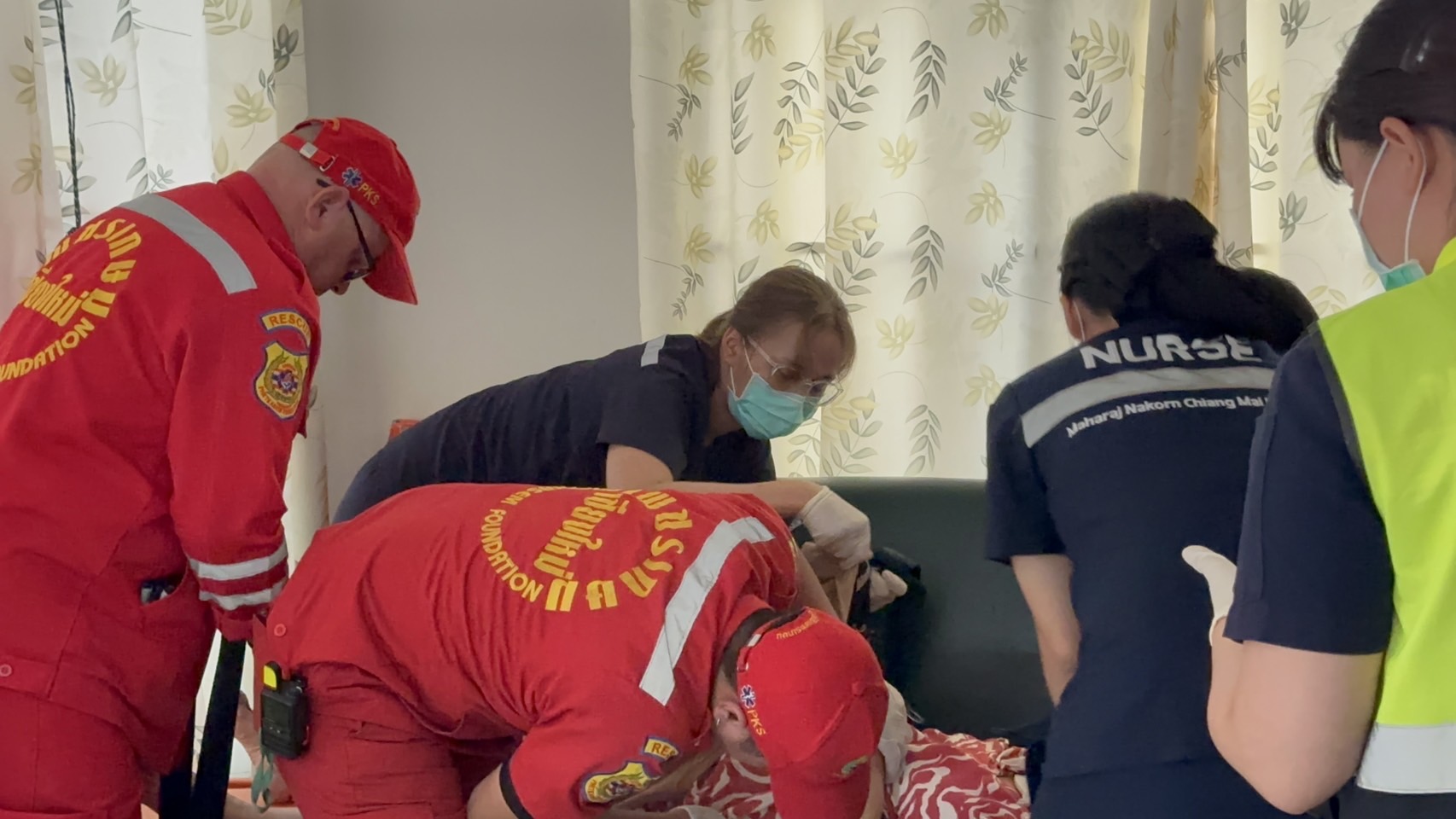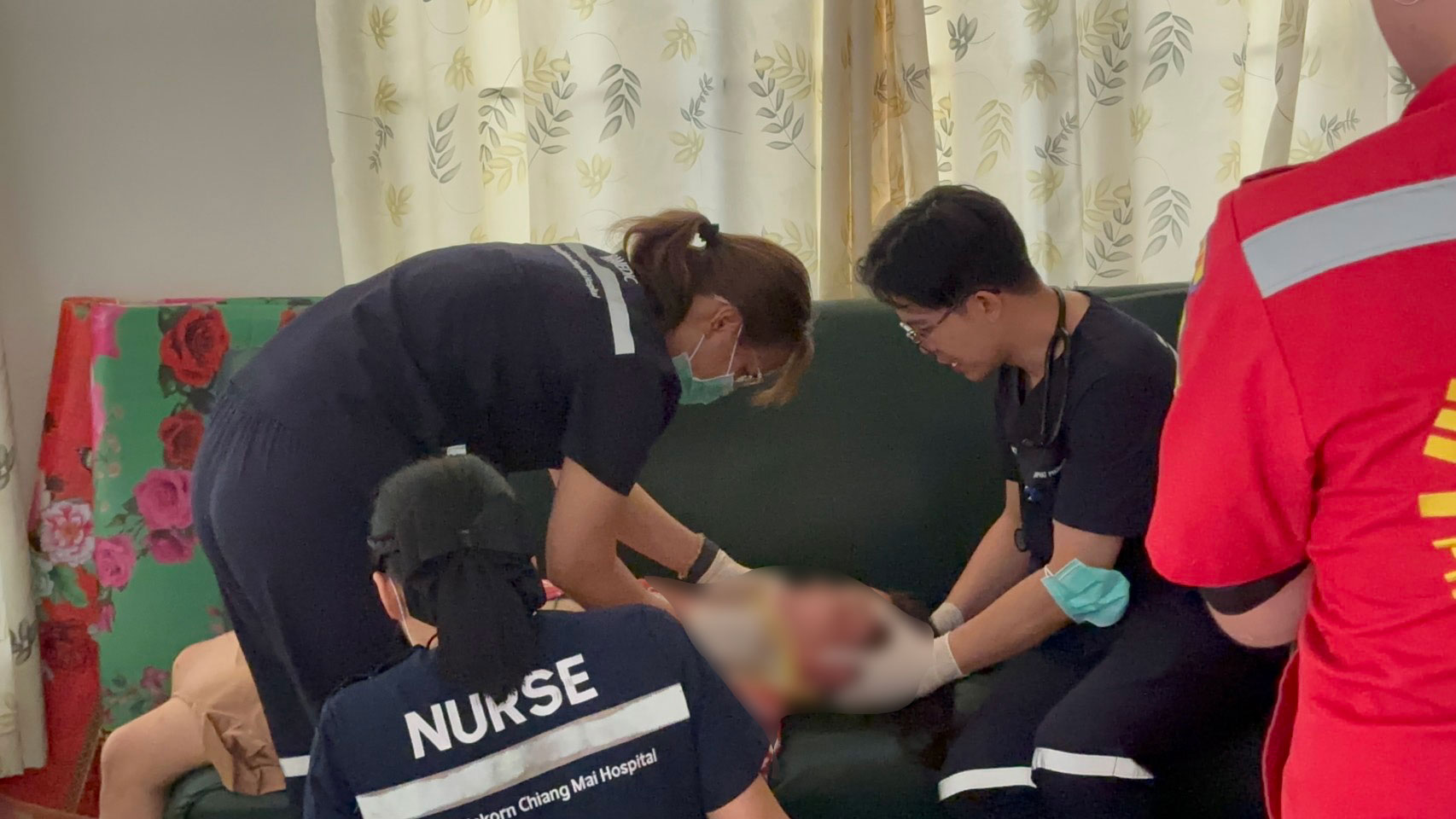 เจ้าหน้าที่พร้อมเพื่อนบ้านต้องพังประตูเข้าไป พบผู้ป่วยแขวนคออยู่กับราวหน้าต่างในบ้าน และอยู่ในภาวะหัวใจหยุดเต้น เจ้าหน้าที่กู้ภัยได้ปฐมพยาบาลเร่งด่วนโดยทำการปั๊มหัวใจ จนสามารถทำให้ชีพจรกลับคืนมา ก่อนเร่งนำตัวส่งต่อให้เจ้าหน้าที่โรงพยาบาลมหาราชนครเชียงใหม่รับไปดูแลอย่างใกล้ชิด