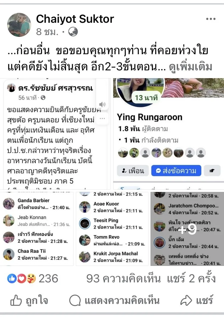 โลกโซเชียล-ลูกศิษย์ร่วมส่งกำลังใจ หลังศาลยกฟ้อง “ครูชัยยศ สุขต้อ” กรณีถูกกล่าวหาทุจริตค่าอาหารนักเรียน จนต้องออกราชการมาขายโรตี ขณะที่เจ้าตัวโพสต์ขอบคุณทุกกำลังใจ ระบุคดียังไม่สิ้นสุด