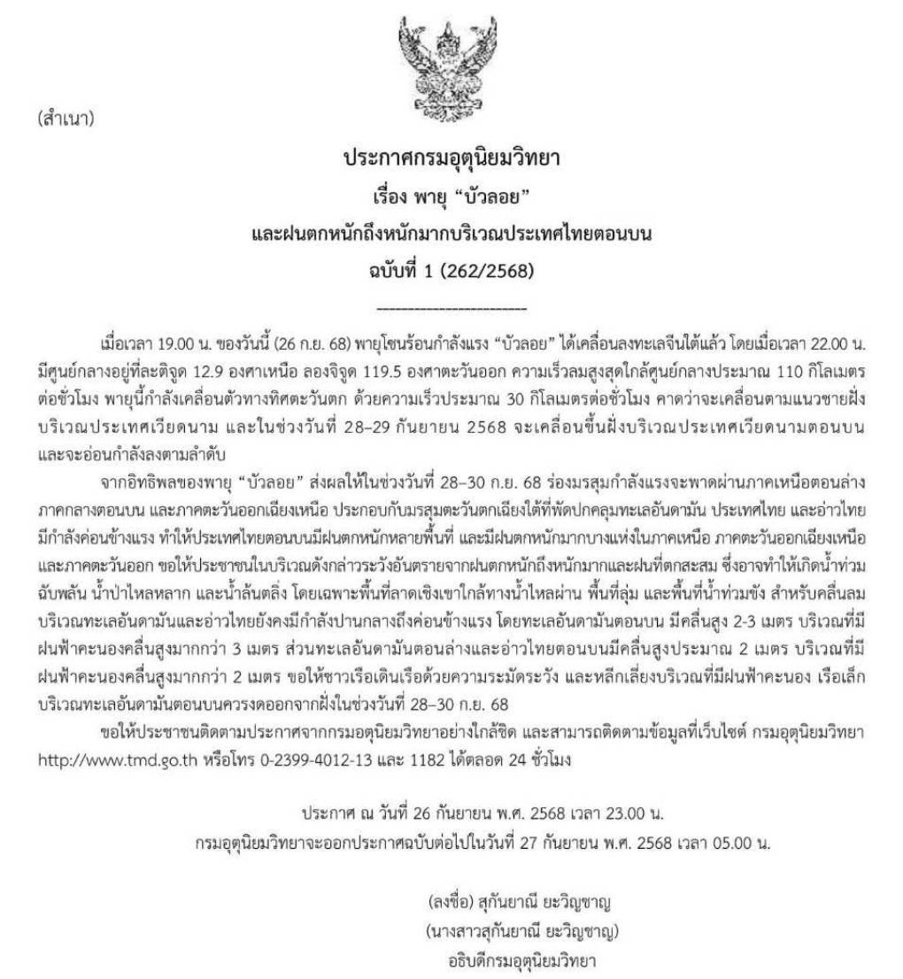 ​แม้พายุ “บัวลอย” จะคาดการณ์ว่าจะเคลื่อนขึ้นฝั่งประเทศเวียดนามตอนบนในช่วงวันที่ 28–29 กันยายน 2568 และอ่อนกำลังลงตามลำดับ แต่อิทธิพลของพายุ จะดึง ร่องมรสุมกำลังแรง ให้พาดผ่าน ภาคเหนือตอนล่าง และภาคกลางตอนบนของไทยอย่างเต็มที่ ประกอบกับมรสุมตะวันตกเฉียงใต้มีกำลังแรงขึ้น