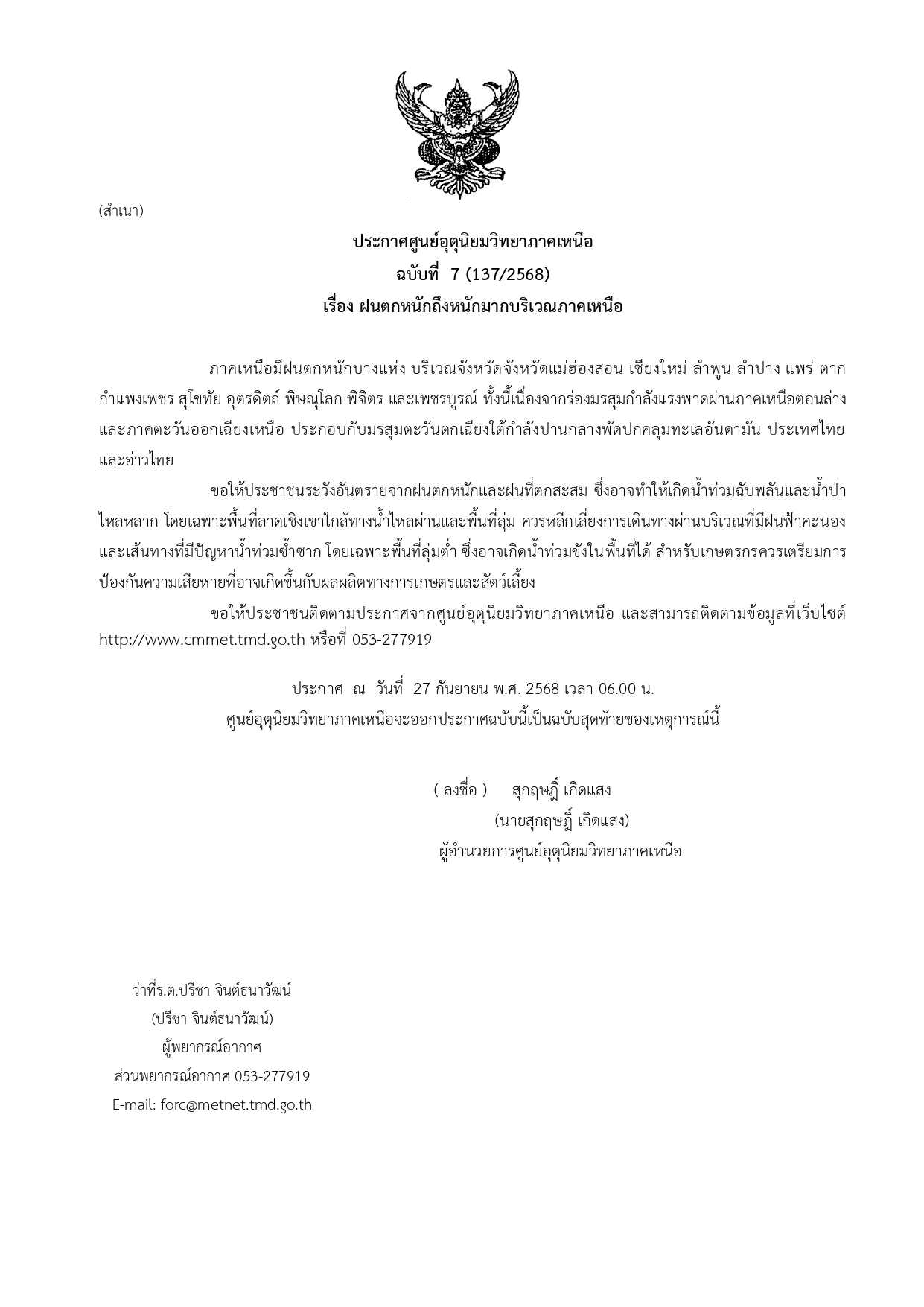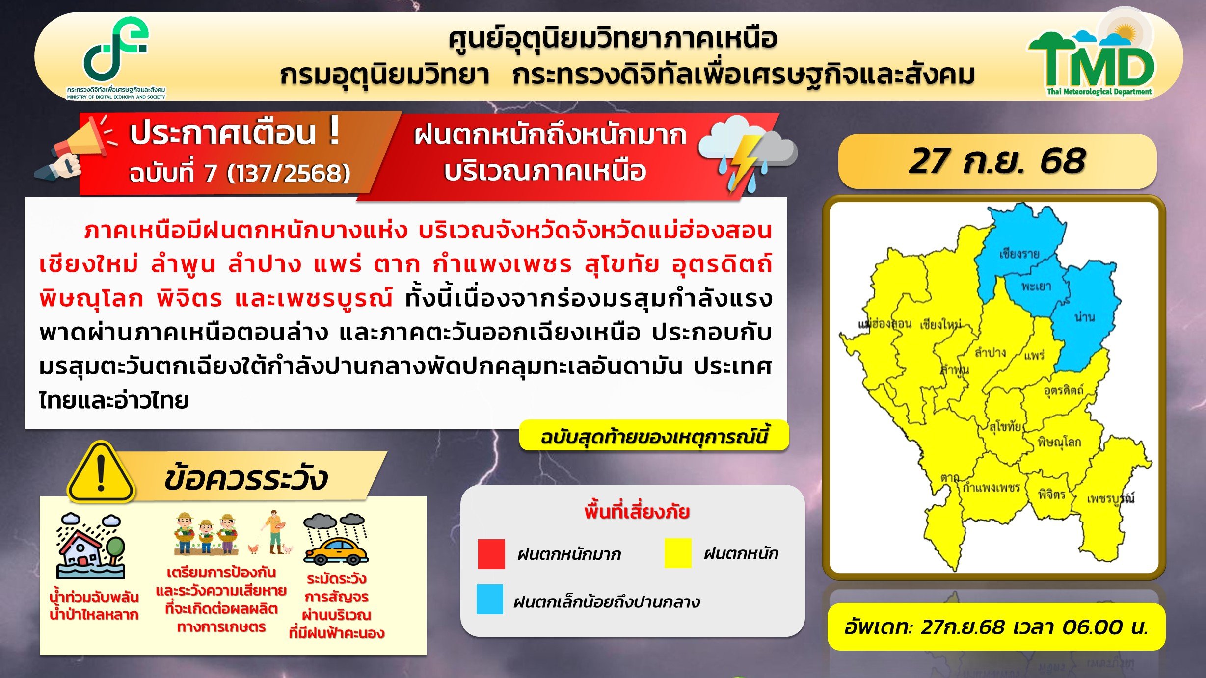 กรมอุตุนิยมวิทยา ออกประกาศเตือนฉบับที่ 1 เรื่อง พายุโซนร้อนกำลังแรง “บัวลอย” ที่จะส่งผลให้ ภาคเหนือ ของประเทศไทย โดยเฉพาะจังหวัด เชียงใหม่ และพื้นที่ใกล้เคียง ต้องเฝ้าระวัง ฝนตกหนักถึงหนักมาก และความเสี่ยง น้ำท่วมฉับพลัน จากร่องมรสุมกำลังแรง ตั้งแต่วันที่ 28 ถึง 30 กันยายน 2568 ประชาชนในพื้นที่ลาดเชิงเขาและที่ลุ่มเสี่ยงต้องเตรียมรับมืออย่างเร่งด่วน
