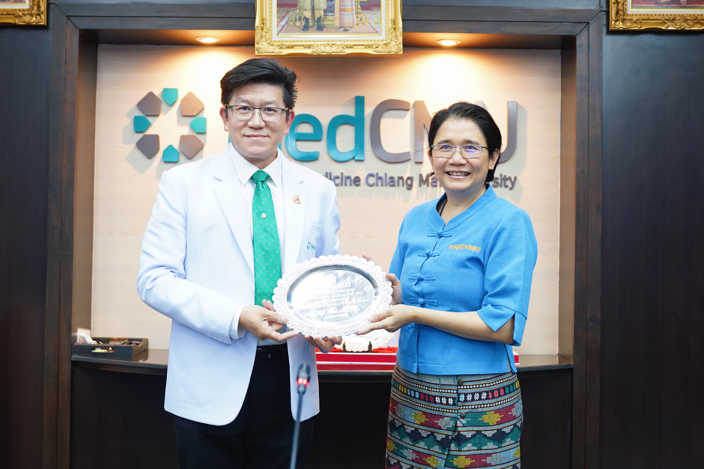 รศ.นพ.นเรนทร์ โชติรสนิรมิต คณบดีคณะแพทยศาสตร์ มหาวิทยาลัยเชียงใหม่ มอบโล่เพื่อแสดงความขอบคุณ แก่ ศ.(เชี่ยวชาญพิเศษ) พญ.เบญจลักษณ์ มณีทอน ในโอกาสครบวาระการดำรงตำแหน่งหัวหน้าภาควิชาจิตเวชศาสตร์ คณะแพทยศาสตร์ มช.