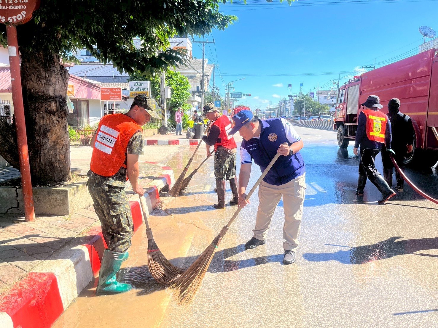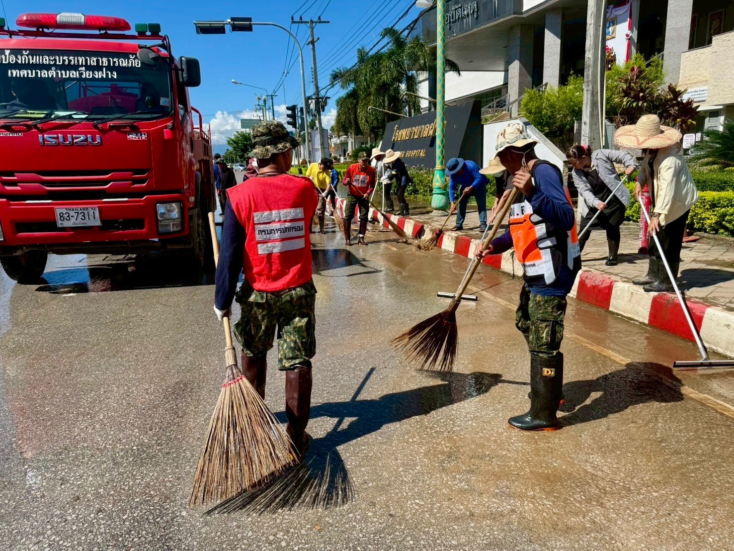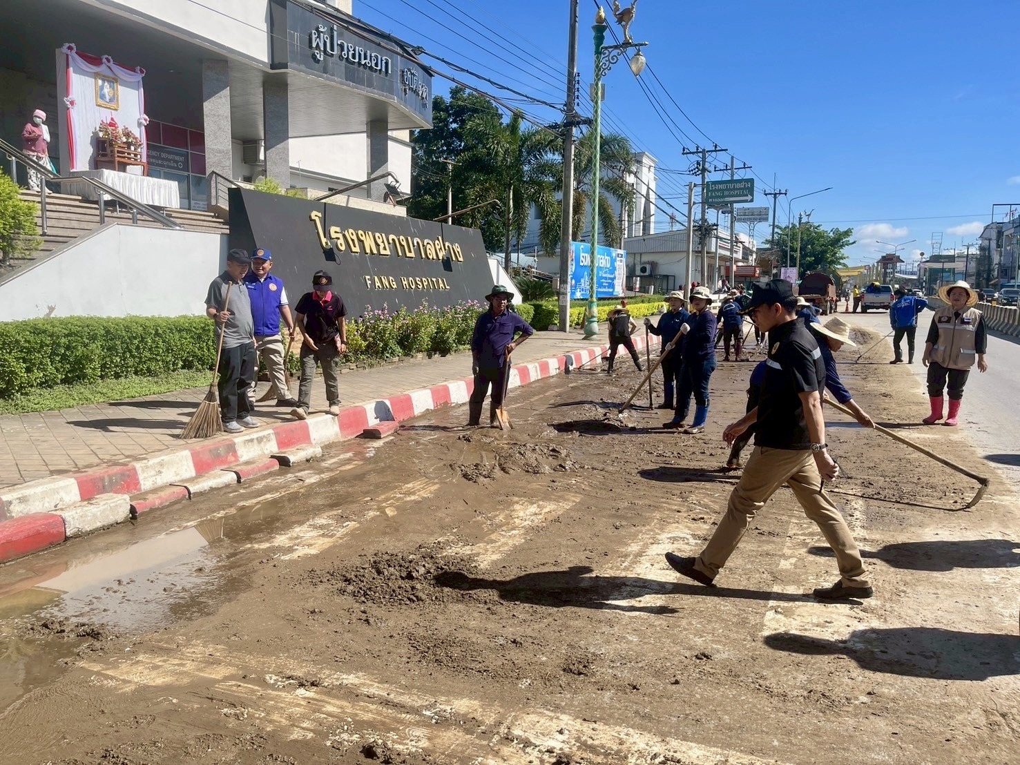 วันที่ 3 ตุลาคม 2568 เวลา 09.00 น. เป็นต้นไป ว่าที่ร้อยตรี นพรัตน์ ศุภกิจโกศล นายอำเภอฝาง มอบหมายให้ นายศตวรรษ อภิวงค์ ปลัดอำเภอฝ่ายความมั่นคง นำกำลัง สมาชิก อส. ร้อย.อส.อ.ฝาง 3 ร่วมกับ เทศบาลตำบลเวียงฝาง ตำรวจ ทหาร กำนัน ผู้ใหญ่บ้าน ตำบลเวียง จิตอาสา และหน่วยงานที่เกี่ยวข้อง ร่วมกิจกรรม Big Cleaning ทำความสะอาดตะกอนดิน ทราย และฝุ่นละอองที่ตกค้างอยู่ตามถนนเส้นทางต่างๆ จากเหตุอุทกภัยฯ ในเขตพื้นที่เทศบาลตำบลเวียงฝาง