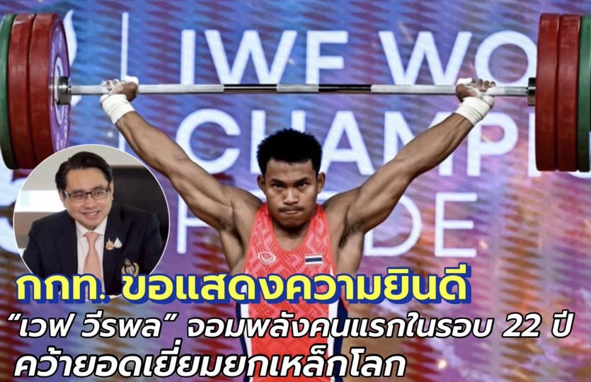 กกท. ขอแสดงความยินดี กับเวฟ วีรพล” จอมพลังคนแรกในรอบ 22 ปี คว้ายอดเยี่ยมยกเหล็กโลกดร. ก้องศักด ยอดมณี ผู้ว่าการการกีฬาแห่งประเทศไทย (กกท.) ขอแสดงความยินดีกับ “เวฟ” วีรพล วิชุมา คว้ารางวัลนักกีฬายอดเยี่ยมชาย หลังเสร็จสิ้นการแข่งขันยกน้ำหนักชิงชนะเลิศแห่งโลก ประจำปี 2568 ระหว่างวันที่ 2-11 ตุลาคม 2568 ที่เมืองฟอร์ด ประเทศนอร์เวย์