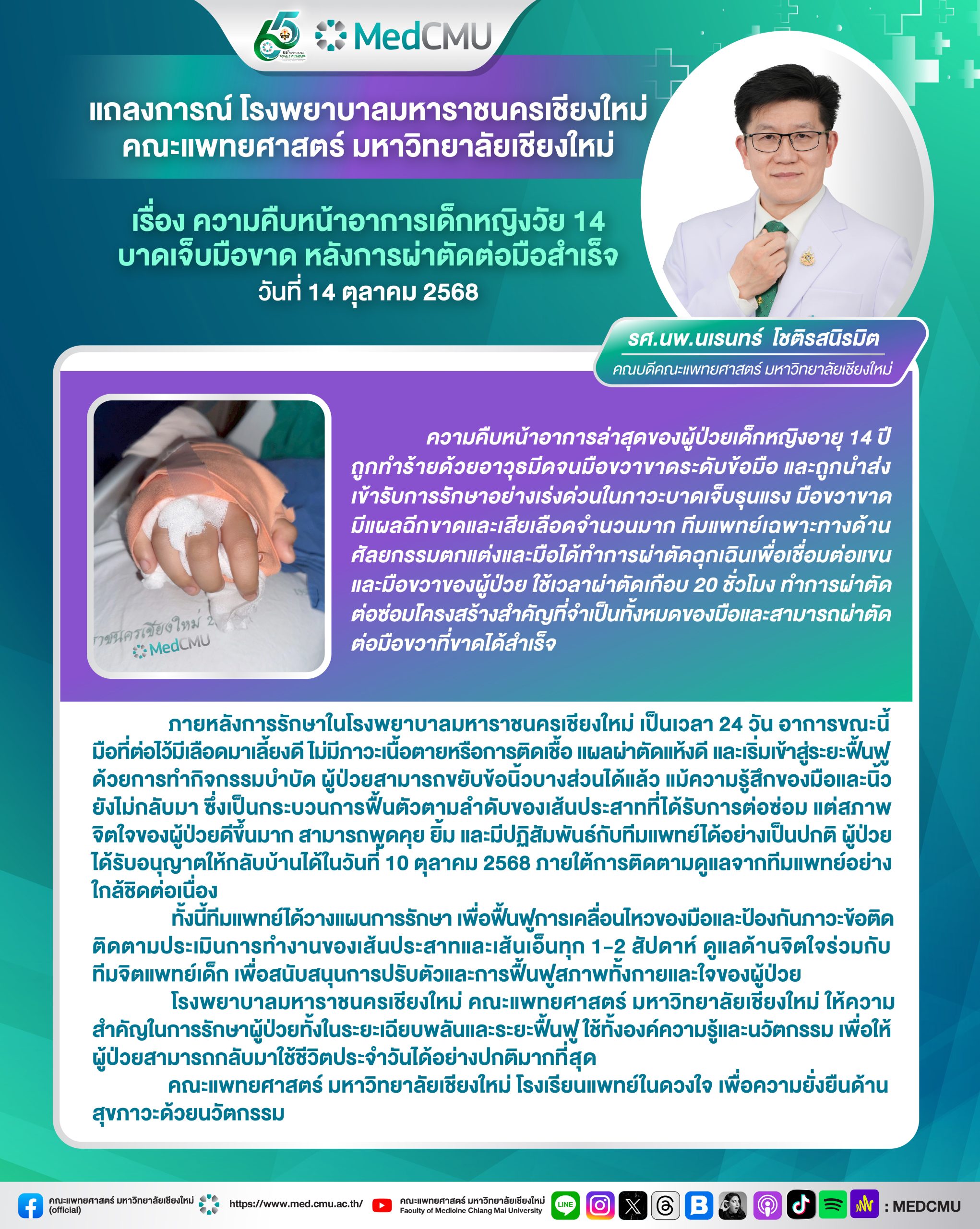 วันที่ 14 ตุลาคม 2568 ความคืบหน้าอาการล่าสุดของผู้ป่วยเด็กหญิงอายุ 14 ปี ถูกทำร้ายด้วยอาวุธมีดจนมือขวาขาดระดับข้อมือ และถูกนำส่งเข้ารับการรักษาอย่างเร่งด่วนในภาวะบาดเจ็บรุนแรง มือขวาขาด มีแผลฉีกขาดและเสียเลือดจำนวนมาก ทีมแพทย์เฉพาะทางด้านศัลยกรรมตกแต่งและมือได้ทำการผ่าตัดฉุกเฉินเพื่อเชื่อมต่อแขนและมือขวาของผู้ป่วย ใช้เวลาผ่าตัดเกือบ 20 ชั่วโมง ทำการผ่าตัดต่อซ่อมโครงสร้างสำคัญที่จำเป็นทั้งหมดของมือและสามารถผ่าตัดต่อมือขวาที่ขาดได้สำเร็จ