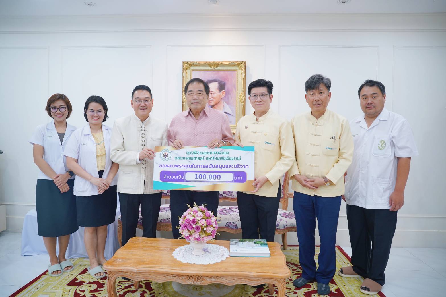 รศ.นพ.นเรนทร์ โชติรสนิรมิต คณบดีคณะแพทยศาสตร์ มหาวิทยาลัยเชียงใหม่ พร้อมด้วย ศ.(เชี่ยวชาญพิเศษ) นพ.บรรณกิจ โลจนาภิวัฒน์ ที่ปรึกษาผู้ทรงคุณวุฒิ คณะแพทยศาสตร์ มช. และ รศ.นพ.ณัฐพงศ์ โฆษชุณหนันท์ รองคณบดีด้านบริหารทั่วไป คณะแพทยศาสตร์ มช. รับมอบเงินบริจาคจำนวน 100,000 บาท จากคุณอนันต์ ลี้ตระกูล สมทบทุนมูลนิธิโรงพยาบาลสวนดอก เพื่อฝ่ายเภสัชกรรม