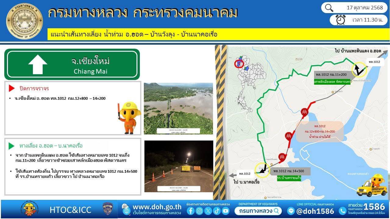 กรมทางหลวง (ทล.) กระทรวงคมนาคม สรุปสถานการณ์ล่าสุด พบการจราจรผ่านไม่ได้ในพื้นที่จังหวัดเชียงใหม่ ดังนี้