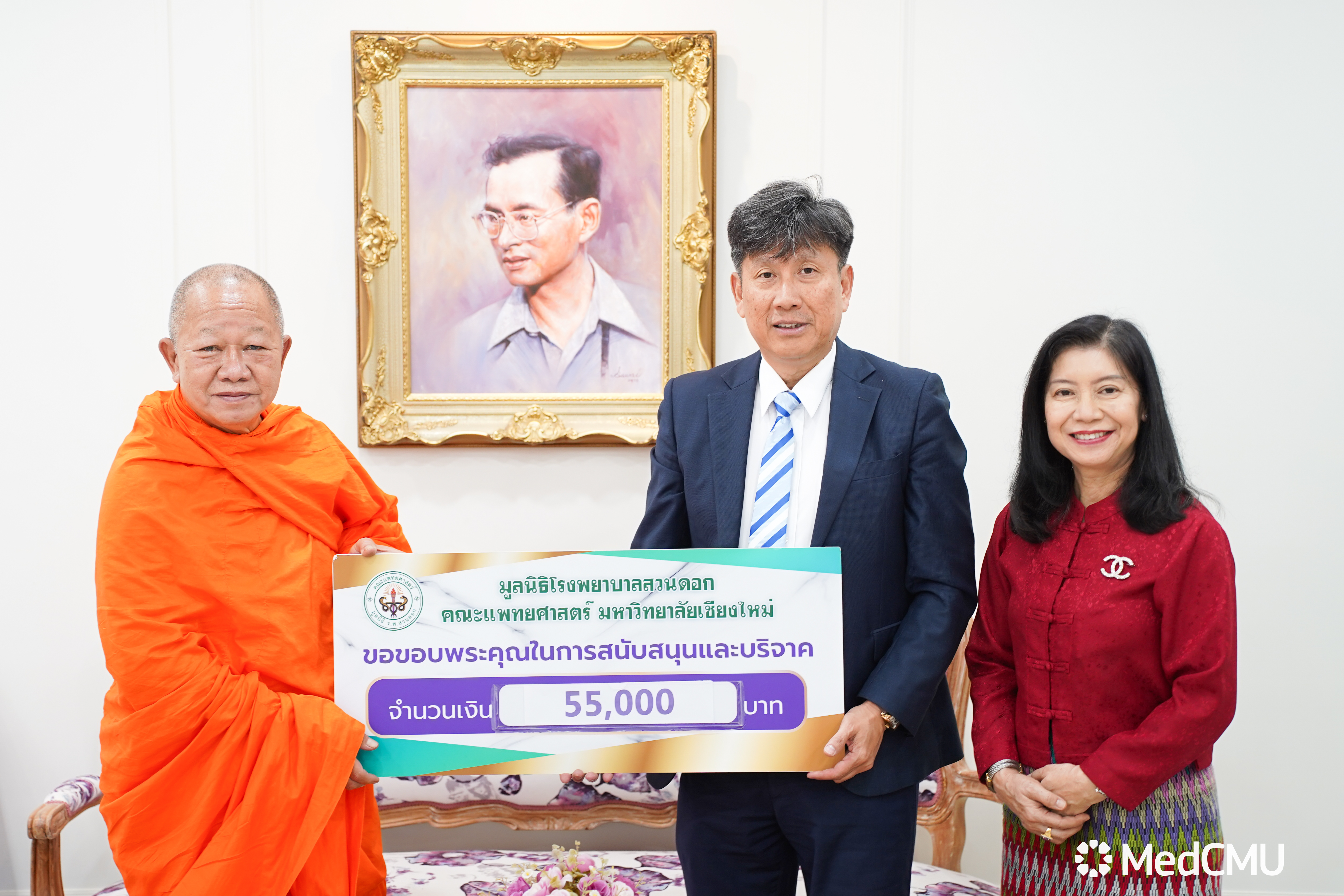 รศ.นพ.ณัฐพงศ์ โฆษชุณหนันท์ รองคณบดีด้านบริหารทั่วไป คณะแพทยศาสตร์ มหาวิทยาลัยเชียงใหม่ พร้อมด้วย คุณพัชรา อุบลศรี ที่ปรึกษาประธานมูลนิธิโรงพยาบาลสวนดอก ร่วมรับมอบเงินบริจาค จำนวน 55,000 บาท
