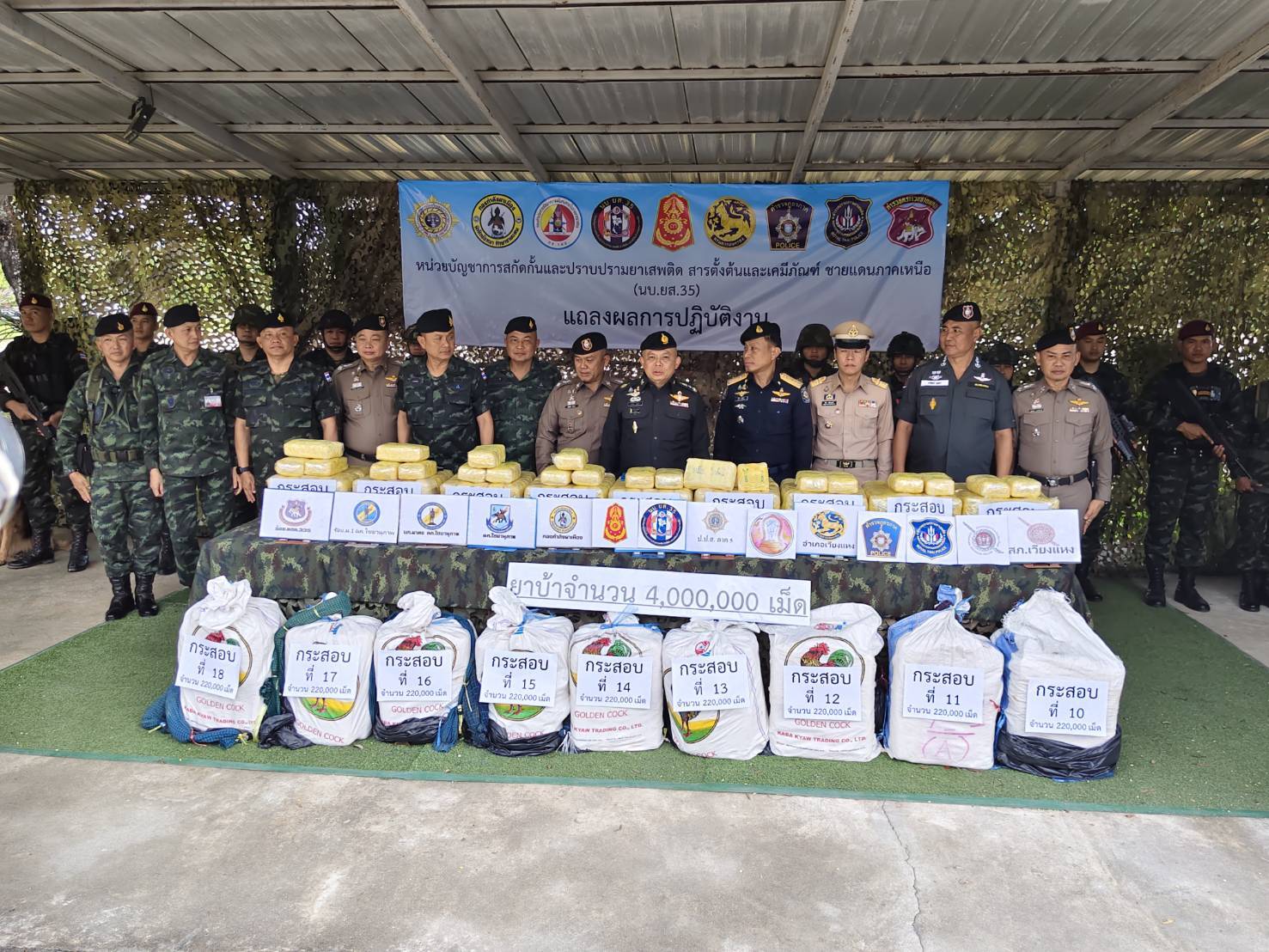 ทั้งนี้ตั้งแต่ 1 ตุลาคม 2568 – ปัจจุบัน หน่วยบัญชาการสกัดกั้นและปราบปรามยาเสพติด สารตั้งต้น และเคมีภัณฑ์ ชายแดนภาคเหนือ (นบ.ยส.35) มีผลการสกัดกั้นและปราบปรามอย่างต่อเนื่อง โดยมีการปะทะกับกลุ่มขบวนการในพื้นที่ชายแดน จำนวน 4 เหตุการณ์ ตรวจยึดจับกุม 8เหตุการณ์ ส่วนใหญ่ อยู่ในพื้นที่ของจังหวัดเชียงราย จังหวัดเชียงใหม่ และ จังหวัดน่าน ตามลำดับ สามารถตรวจยึด จับกุม ยาบ้า ได้กว่า 14.8 ล้านเม็ดเศษ ไอซ์ 570 กิโลกรัม เฮโรอีน 1 กิโลกรัม