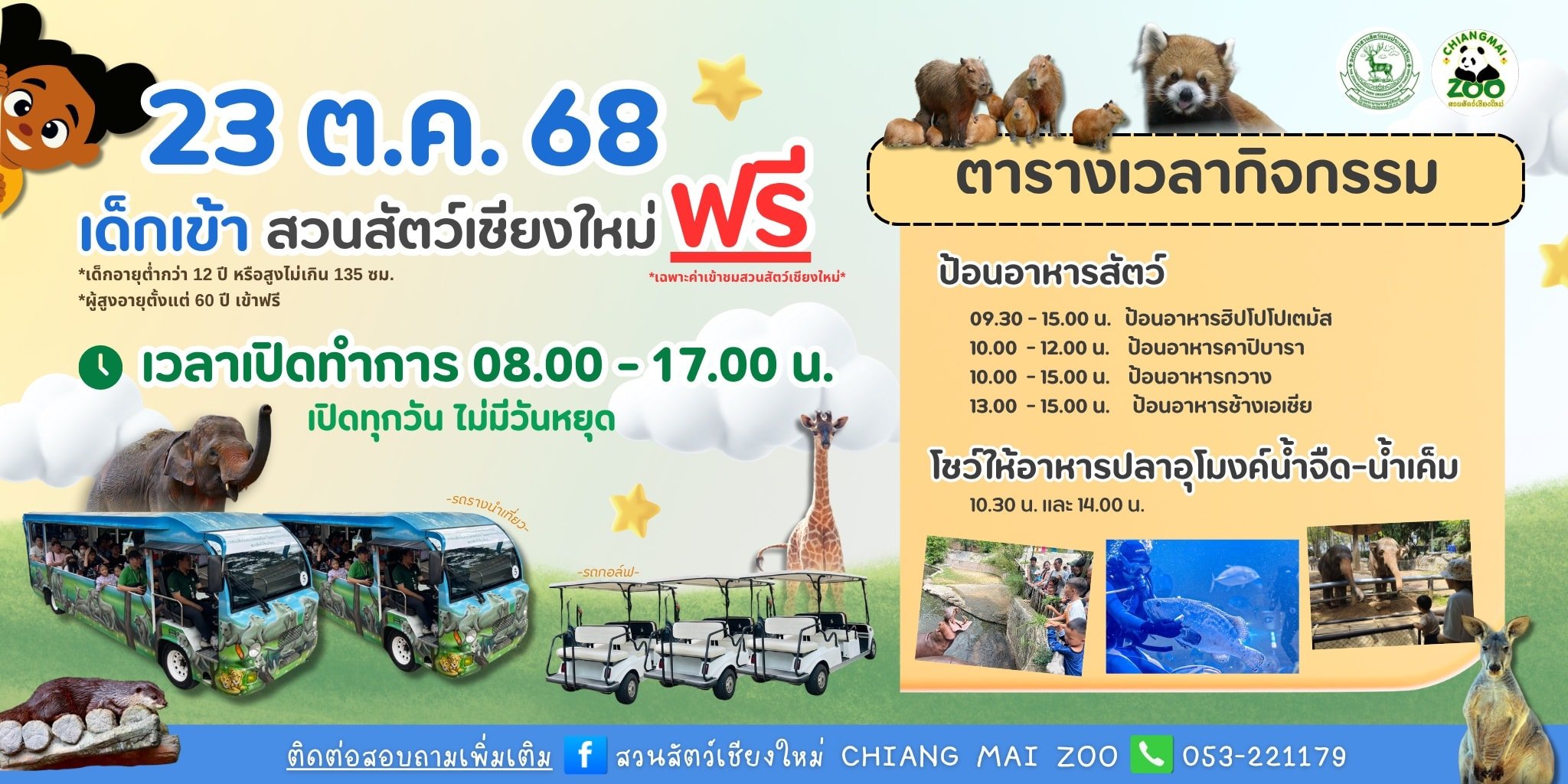สวนสัตว์เชียงใหม่ขอเชิญชวนทุกครอบครัวร่วมใช้วันหยุดแห่งความสุขในวันที่ 23 ตุลาคมนี้ พาเด็กๆ และผู้สูงอายุมาท่องโลกแห่งสัตว์แสนรู้ เข้าชมฟรี! พร้อมเปิดประสบการณ์แห่งการเรียนรู้ ความสนุก และความสุขท่ามกลางธรรมชาติที่สวยงามของสวนสัตว์เชียงใหม่