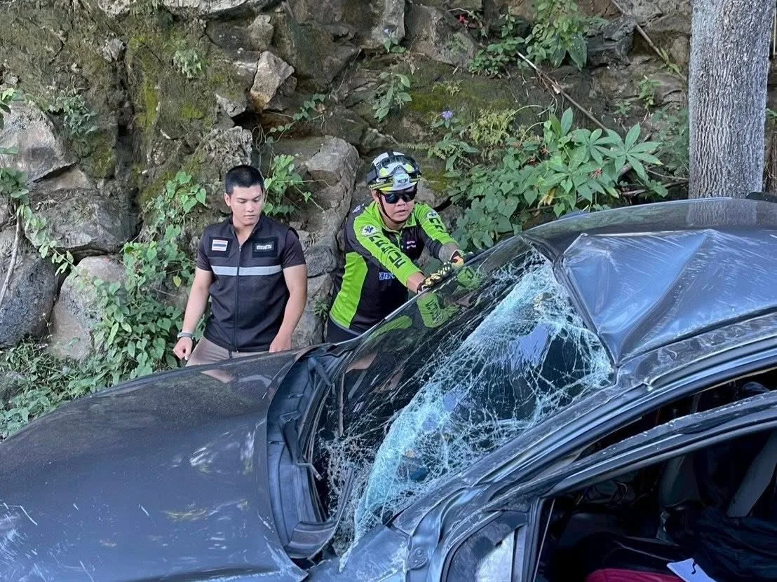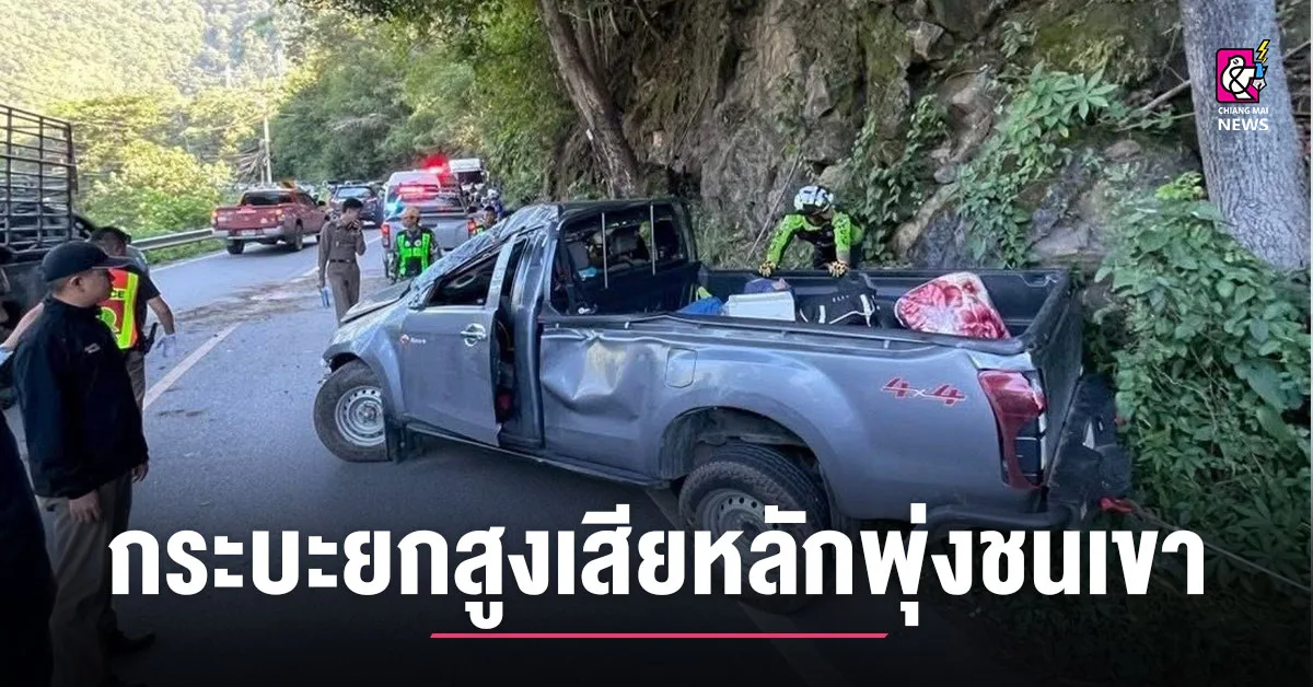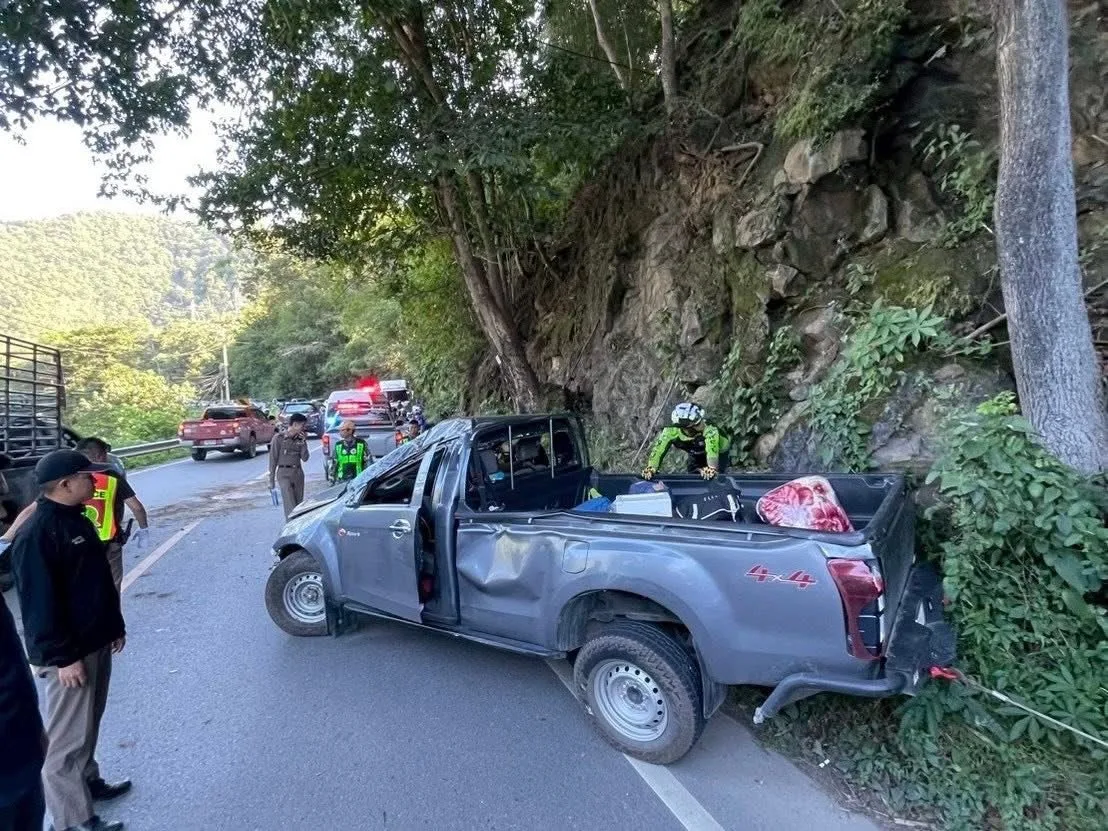 รถกระบะยกสูงเสียหลักพุ่งชนเขา บนถนนสายฮอด-แม่สะเรียง พลิกคว่ำหงายท้อง ผู้โดยสารดับ1สาหัส 4
