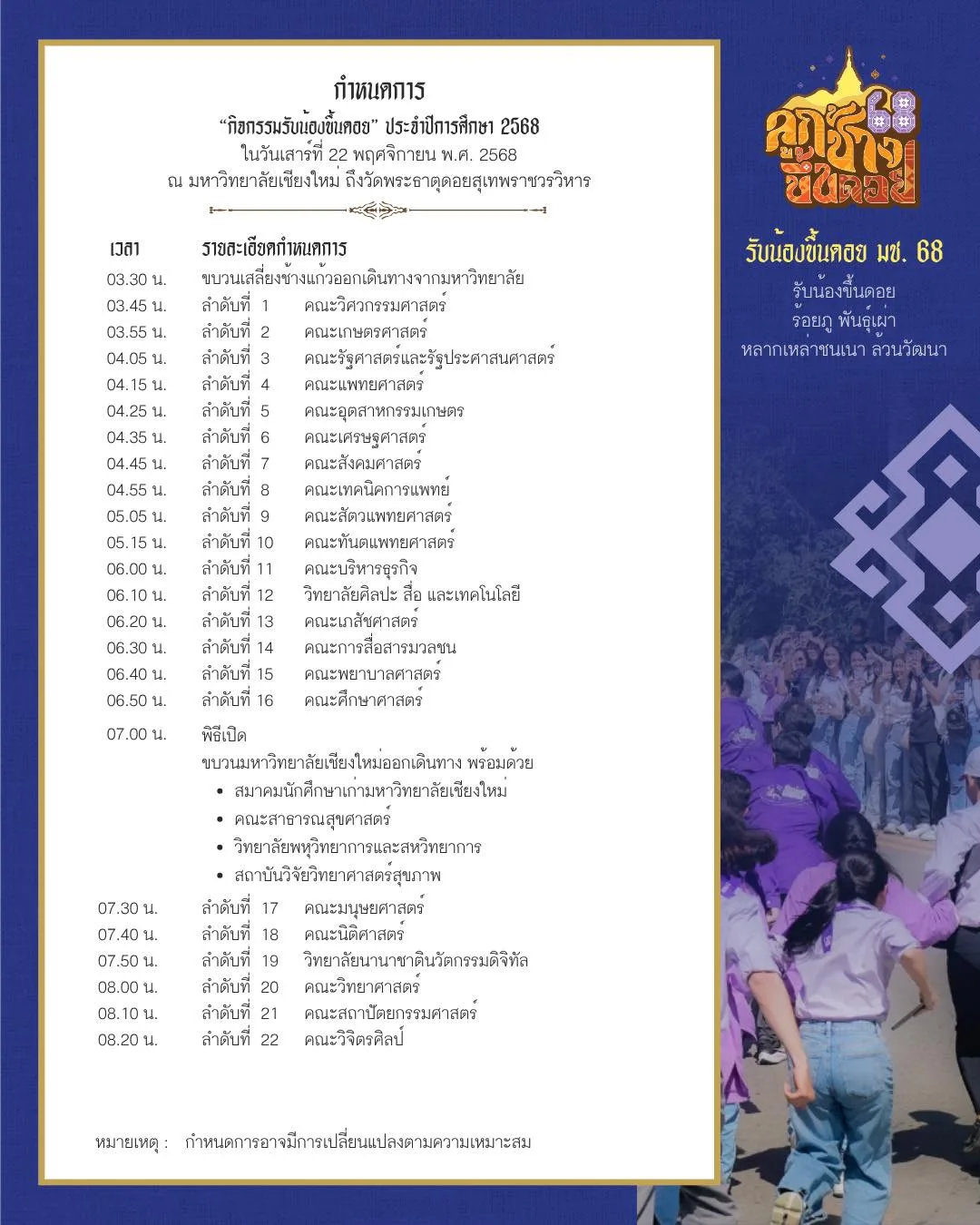 ในปีนี้ ขบวนกิจกรรมจะเริ่มต้นตั้งแต่เวลา 03.30 น. โดยมี “ขบวนเสลี่ยงช้างแก้ว” ออกเดินทางนำหน้า ตามด้วยขบวนของนักศึกษาจากคณะต่าง ๆ ขบวนงานประเพณีลูกช้างขึ้นดอย ผู้แทนนักศึกษาจากคณะต่างๆ ร่วมกันอัญเชิญเครื่องสักการะพระธาตุ และต่อด้วยขบวนของนักศึกษาแต่ละคณะ ซึ่งพร้อมใจสวมชุดพื้นเมืองอันเป็นเอกลักษณ์ของชาวเชียงใหม่ เพื่ออนุรักษ์ประเพณีอันงดงามของวัฒนธรรมล้านนาเพื่อแสดงถึงเอกลักษณ์ทางวัฒนธรรมและความภาคภูมิใจในรากเหง้าแห่งล้านนา เมื่อถึงวัดพระบรมธาตุดอยสุเทพ นักศึกษารุ่นพี่จะนำน้องใหม่เข้าสักการะพระบรมธาตุ เพื่อความเป็นสิริมงคลในชีวิตการศึกษา และเป็นการเริ่มต้นบทบาทของการเป็น “ลูกช้างมหาวิทยาลัยเชียงใหม่” อย่างสมบูรณ์