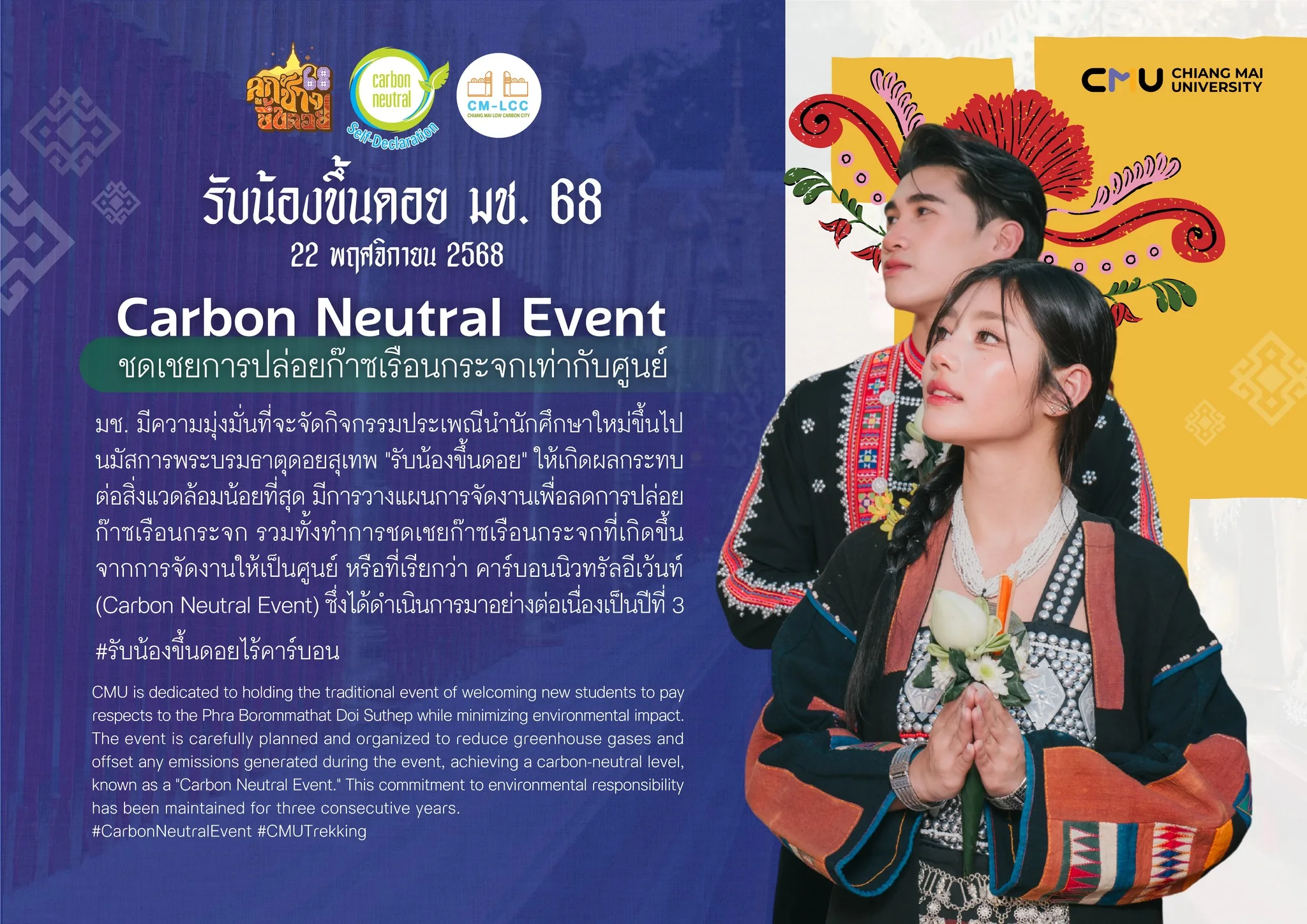 นอกจากจะเป็นประเพณีแห่งความสามัคคีและวัฒนธรรมแล้ว “รับน้องขึ้นดอย” ยังเป็นหนึ่งในแบบอย่างของการจัดกิจกรรมที่รับผิดชอบต่อสังคมและสิ่งแวดล้อม โดยในปี 2568 มหาวิทยาลัยเชียงใหม่ได้วางแผนจัดกิจกรรมให้เกิด คาร์บอนน้อยที่สุด (Low Carbon Event) พร้อมดำเนินการ ชดเชยคาร์บอนให้เท่ากับศูนย์ (Carbon Neutral Event) เพื่อสนับสนุนเป้าหมายการเป็น Carbon Neutral University ของมหาวิทยาลัยในทุกมิติ และร่วมขับเคลื่อนโครงการ “เชียงใหม่เมืองคาร์บอนต่ำ” (Chiangmai Low Carbon City) อย่างยั่งยืน