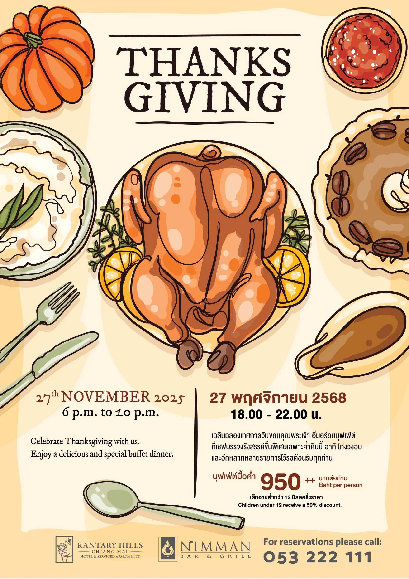 ห้องอาหารนิมมาน บาร์ แอนด์ กริล โรงแรมแคนทารีฮิลส์เชียงใหม่ ชวนชาวเชียงใหม่มาร่วมเฉลิมฉลองเทศกาลวันขอบคุณพระเจ้า (Thanksgiving Day 2025) ในค่ำคืนวันพฤหัสบดี ที่ 27 พฤศจิกายนนี้ ท่ามกลางบรรยากาศที่อบอุ่น และอิ่มอร่อยไปกับบุฟเฟ่ต์ดินเนอร์สุดพิเศษ ด้วยขบวนความอร่อยหลากหลาย