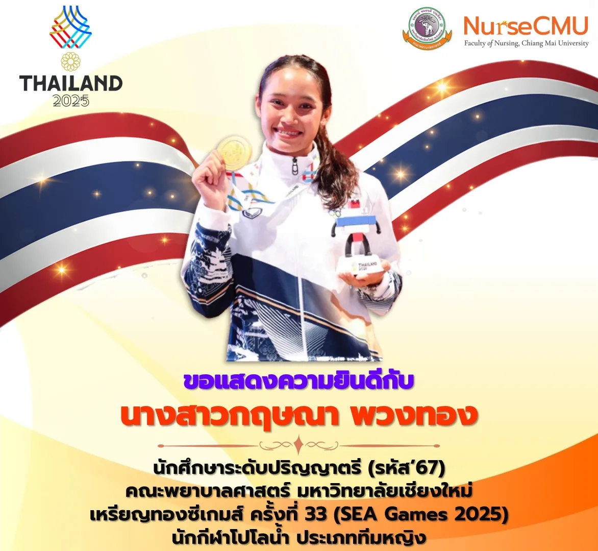 คณะพยาบาลศาสตร์ มหาวิทยาลัยเชียงใหม่ ขอแสดงความยินดีและภาคภูมิใจกับ นางสาวกฤษณา พวงทอง (เค้ก) นักศึกษาระดับปริญญาตรี (รหัส’ 671210010)