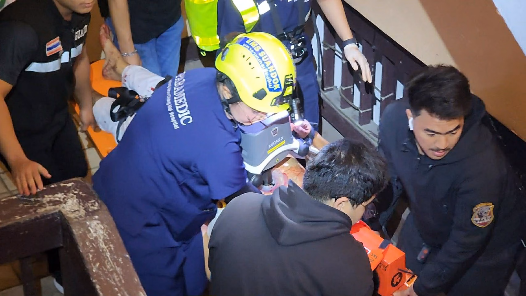 ส่วนผู้บาดเจ็บอีก 2 ราย ถูกแทงเข้าที่บริเวณหน้าท้อง ได้รับบาดเจ็บสาหัส เจ้าหน้าที่เร่งปฐมพยาบาลเบื้องต้นและลำเลียงส่งโรงพยาบาลโดยเร็ว