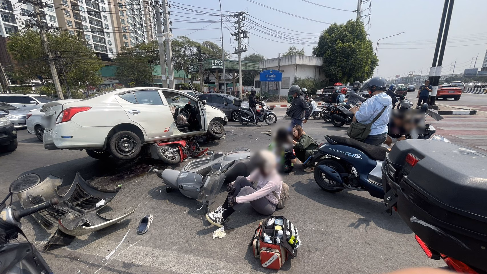 เมื่อเวลาประมาณ 13.20 น. วันนี้ (4 มี.ค.69) เจ้าหน้าที่กูภัย พร้อมด้วยเจ้าหน้าที่ตำรวจ เร่งเข้าช่วยเหลือผู้บาดเจ็บและเคลียร์เส้นทางบนถนนบริเวณกลางสี่แยกศาลเด็ก ต.วัดเกต อ.เมืองเชียงใหม่ ภายหลังจากที่เกิดอุบัติเหตุรถชนและมีคนได้รับบาดเจ็บหลายราย โดยในที่เกิดเหตุพบรถยนต์เก๋งนิสสันอัลเมร่า สีขาว หมายเลขทะเบียน งต XXXX เชียงใหม่ สภาพรถพุ่งข้ามเล่นถนนชนกับรถจักรยานยนต์อีก 2 คัน ด้านหน้ารถพังยับ และมีรถจักรยานยนต์สีแดงถูกทับอยู่ใต้ท้องรถ นอกจากนี้มีรถจักรยานยนต์เวสป้า สีเทา อีก 1 คันถูกเฉี่ยวชนล้มอยู่ที่เกิดเหตุ