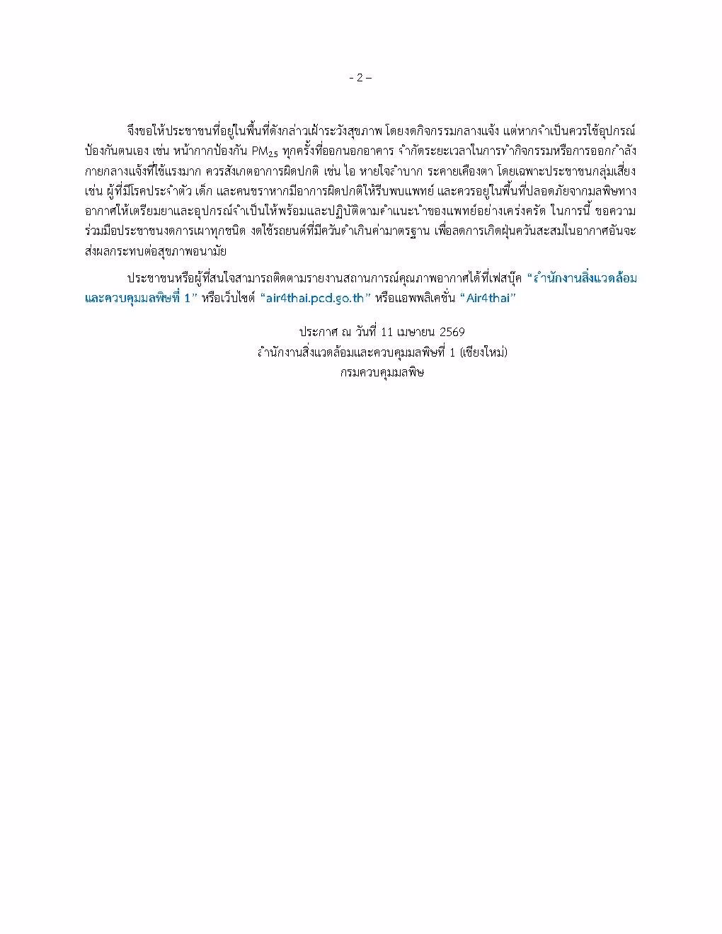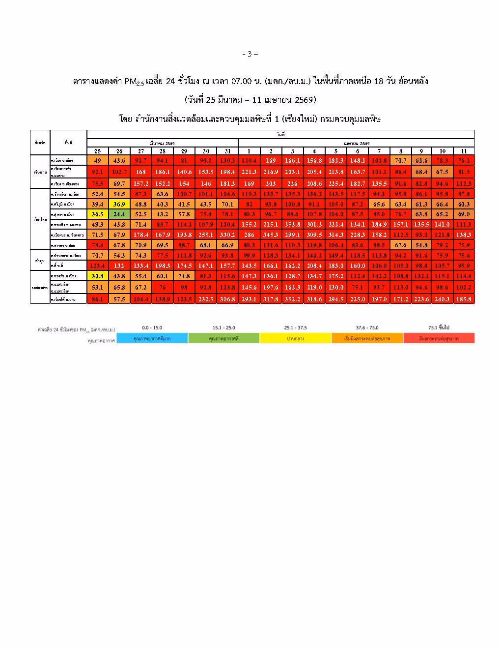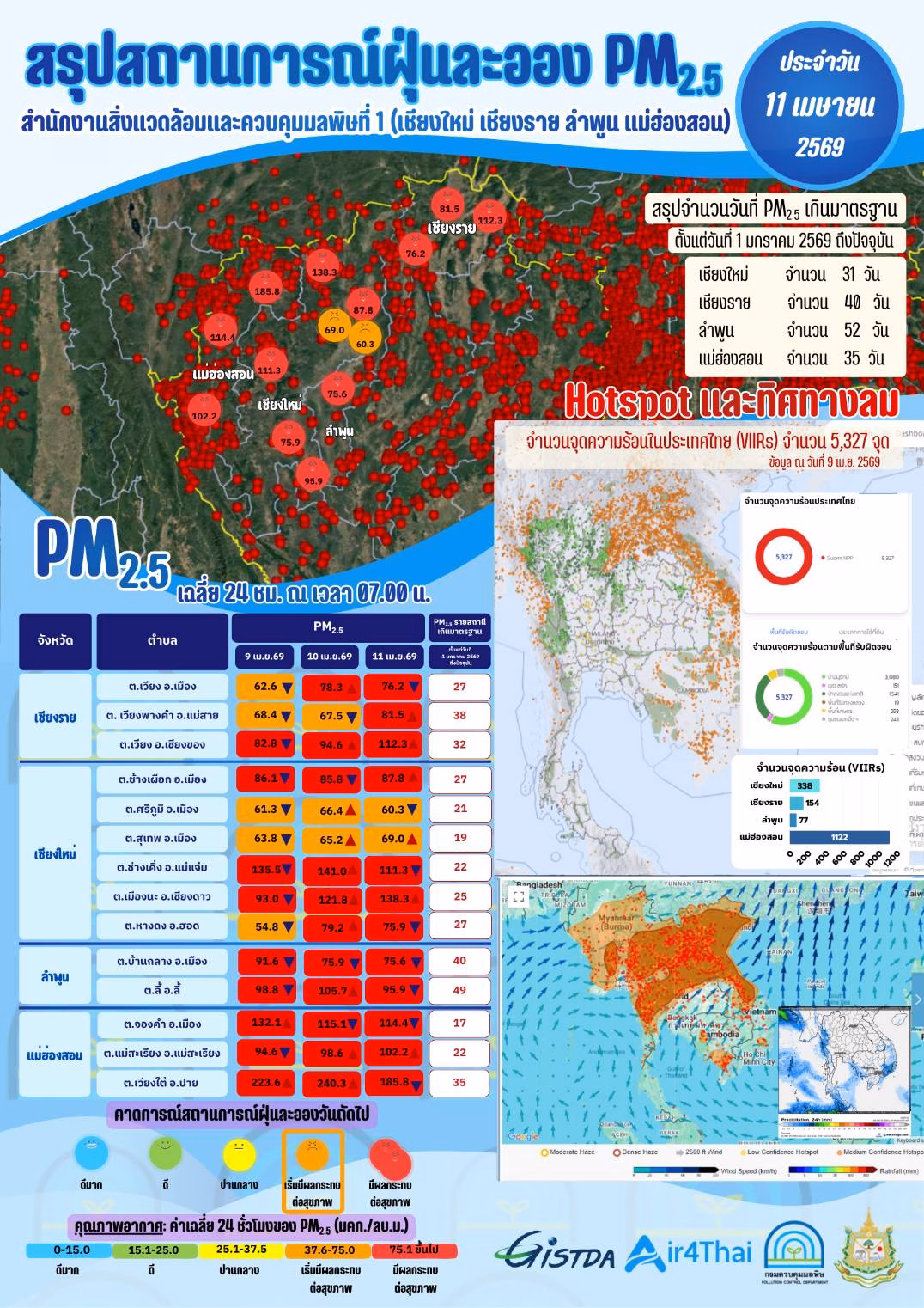 สรุปสถานการณ์ฝุ่น PM2.5 เฉลี่ย 24 ชั่วโมง ณ เวลา 07.00 น. ประจำวันที่ 11 เมษายน 2569 ในพื้นที่รับผิดชอบของสำนักงานสิ่งแวดล้อมและควบคุมมลพิษที่ 1 (เชียงใหม่ เชียงราย ลำพูน แม่ฮ่องสอน)