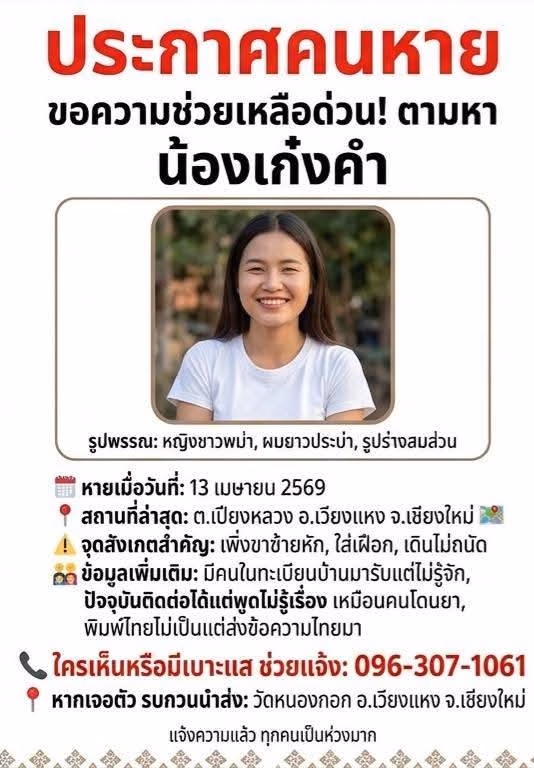 สภาพร่างกาย “น้องเก๋งคำ” เพิ่งออกจากโรงพยาบาลได้เพียง 2 เดือน หลังประสบอุบัติเหตุรถชนจน “ขาหัก” สภาพร่างกายยังไม่สมบูรณ์ ทำงานเป็นคนงานคัดไข่ไก่ ที่โรงงานแห่งหนึ่งใน อ.หางดง และเดินทางมาที่บ้านของนายเดือน แฟนหนุ่มที่บ้านหนองกอก ต.เปียงหลวง ในเทศกาลสงกรานต์แล้วหายตัวไป ขณะนี้ยังโทรติดต่อได้แต่ไม่รับสาย และยังโพสต์ลงโซเชียลในไลน์ของน้องเก๋งคำเป็นภาษาไทยทั้งที่เขียนภาษาไทยไม่ได้ ทำให้ครอบครัวเป็นห่วงมาก