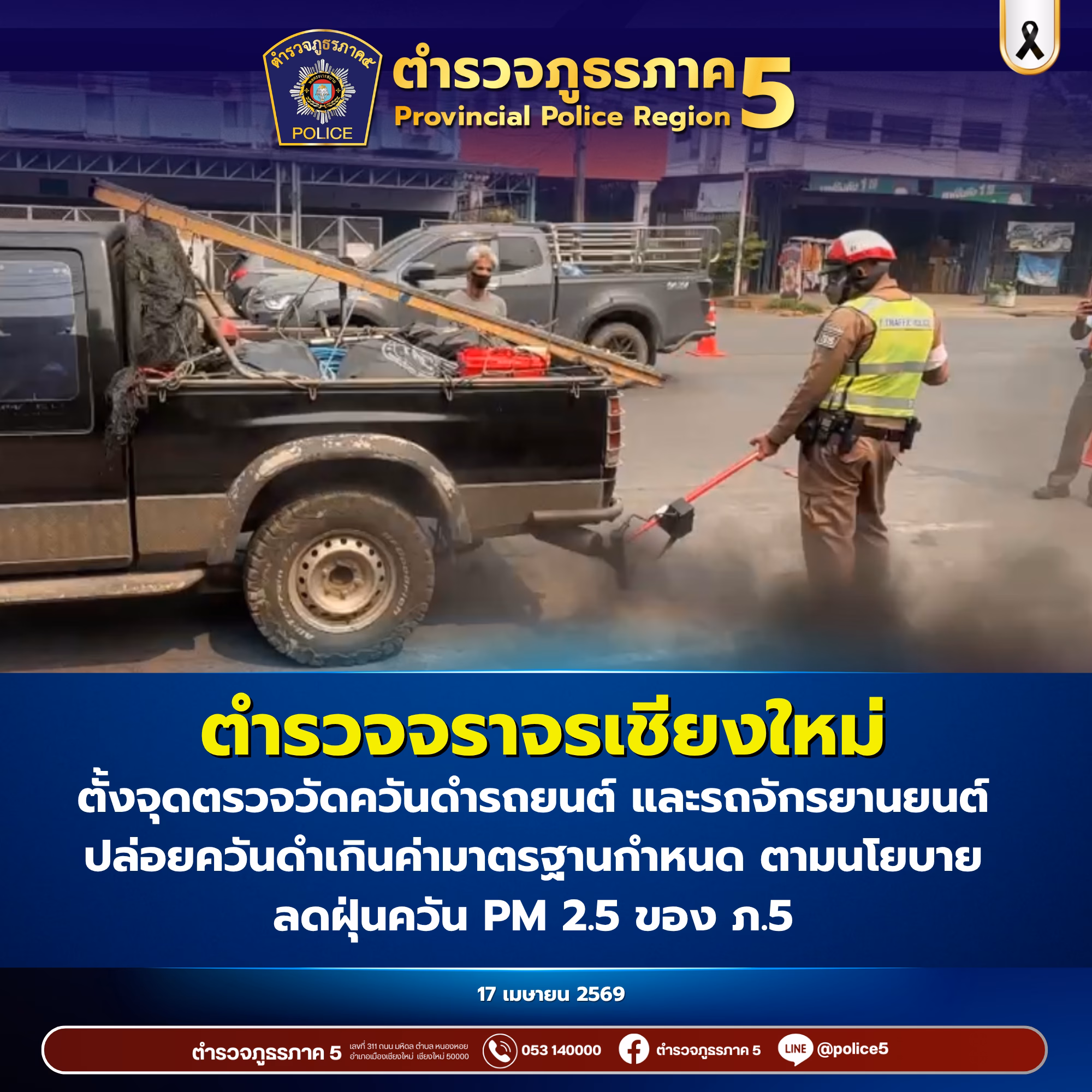 ในการนี้ ตำรวจภูธรภาค 5 จึงขอความร่วมมือประชาชน งดการนำรถยนต์และรถจักรยานยนต์ตลอดจนยานพาหนะประเภทต่างๆที่ปล่อยควันดำเกินค่ามาตรฐานกำหนดมาใช้ขับขี่บนท้องถนน ทั้งนี้เพื่อลดฝุ่นละออง PM 2.5 ในอากาศและเพื่อลมหายใจและเศรษฐกิจของคนเหนือต่อไป