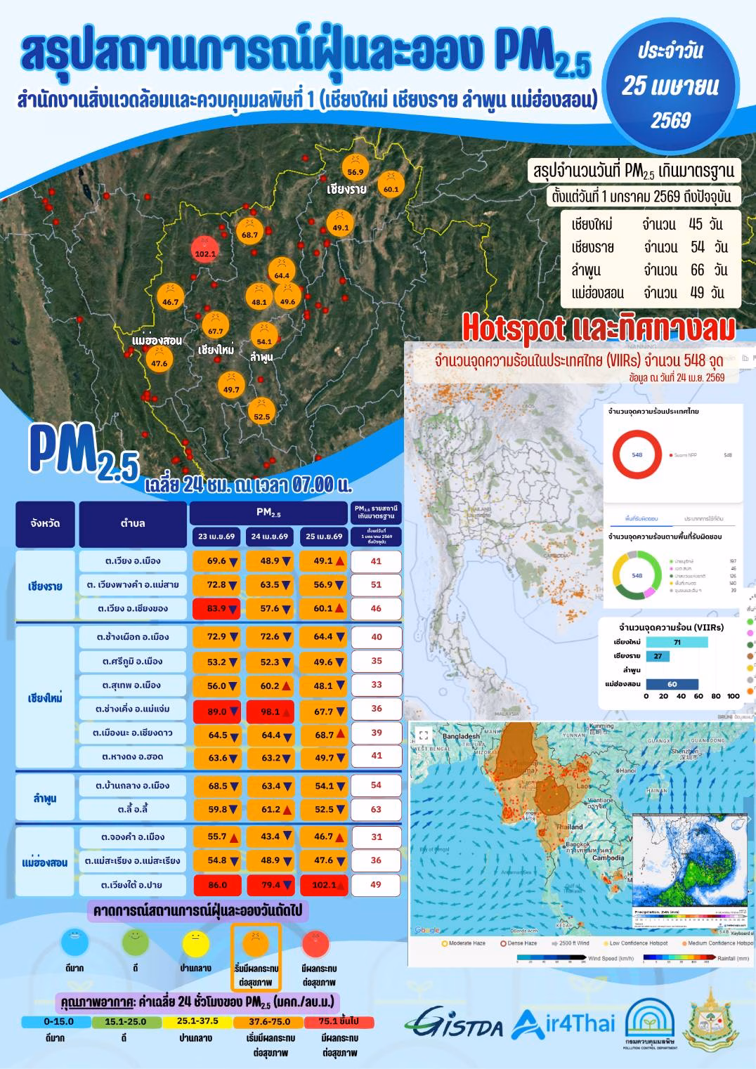 สรุปสถานการณ์ฝุ่น PM2.5 เฉลี่ย 24 ชั่วโมง ณ เวลา 07.00 น. ประจำวันที่ 25 เมษายน 2569 ในพื้นที่รับผิดชอบของสำนักงานสิ่งแวดล้อมและควบคุมมลพิษที่ 1 (เชียงใหม่ เชียงราย ลำพูน แม่ฮ่องสอน)