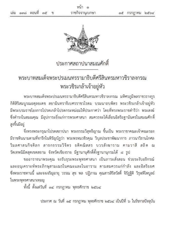พระบาทสมเด็จพระปรเมนทรรามาธิบดีศรีสินทรมหาวชิราลงกรณ มหิศรภูมิพลราชวรางกูร กิติสิริสมบูรณอดุลยเดช สยามินทราธิเบศรราชโรดม บรมนาถบพิตร พระวชิรเกล้าเจ้าอยู่หัว มีพระบรมราชโองการโปรดเกล้าโปรดกระหม่อม เลื่อนอิสริยฐานันดรในสมณศักดิ์ ทรงพระกรุณาโปรดสถาปนา พระธรรมวิสุทธิญาณ ขึ้นเป็น พระราชาคณะเจ้าคณะรอง มีราชทินนามตามที่จารึกในหิรัญบัฏว่า พระพรหมวชิรคุณ วิบุลประชาพัฒนาการ ภาวนาวิธานโกศล