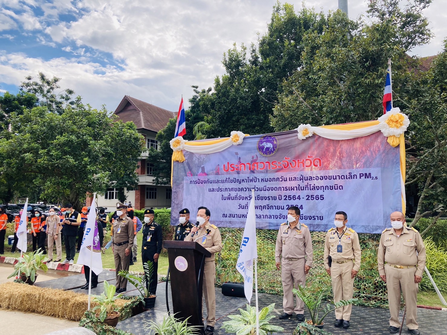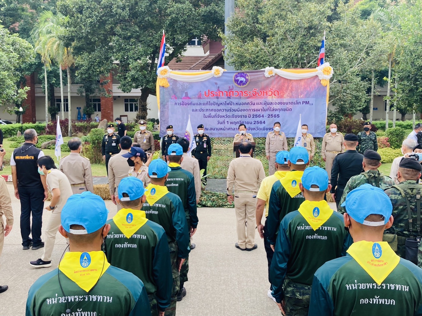เมื่อ 1 พ.ย. 64 เวลา 1500 พ.อ. กิตติพล ไพรหิรัญ รอง ผอ.รมน.จังหวัด ช.ร.(ท.) พร้อมด้วย กำลังพลกองอำนวยการรักษาความมั่นคงภายในจังหวัดเชียงราย ร่วมกิจกรรมปล่อยแถวขบวนรณรงค์กิจกรรม ประกาศวาระจังหวัดเชียงรายในการรณรงค์ป้องกันและแก้ไขไฟป่า หมอกควัน และฝุ่นละอองขนาดเล็ก PM2.5 และประกาศขอความร่วมมืองดการเผาในที่โล่งทุกชนิดในพื้นที่จังหวัดเชียงราย ประจำปี 2564-2565 (Kick off) ณ สนามหน้าศาลากลางจังหวัดเชียงราย โดยมี นายภาสกร บุญญลักษม์ ผวจ.ช.ร./ผอ.รมน.จังหวัด ช.ร. เป็นประธาน มีผู้เข้าร่วมกิจกรรมดังกล่าว จำนวน 250 คน ผลการปฏิบัติเป็นไปด้วยความเรียบร้อย