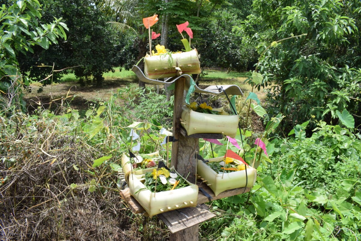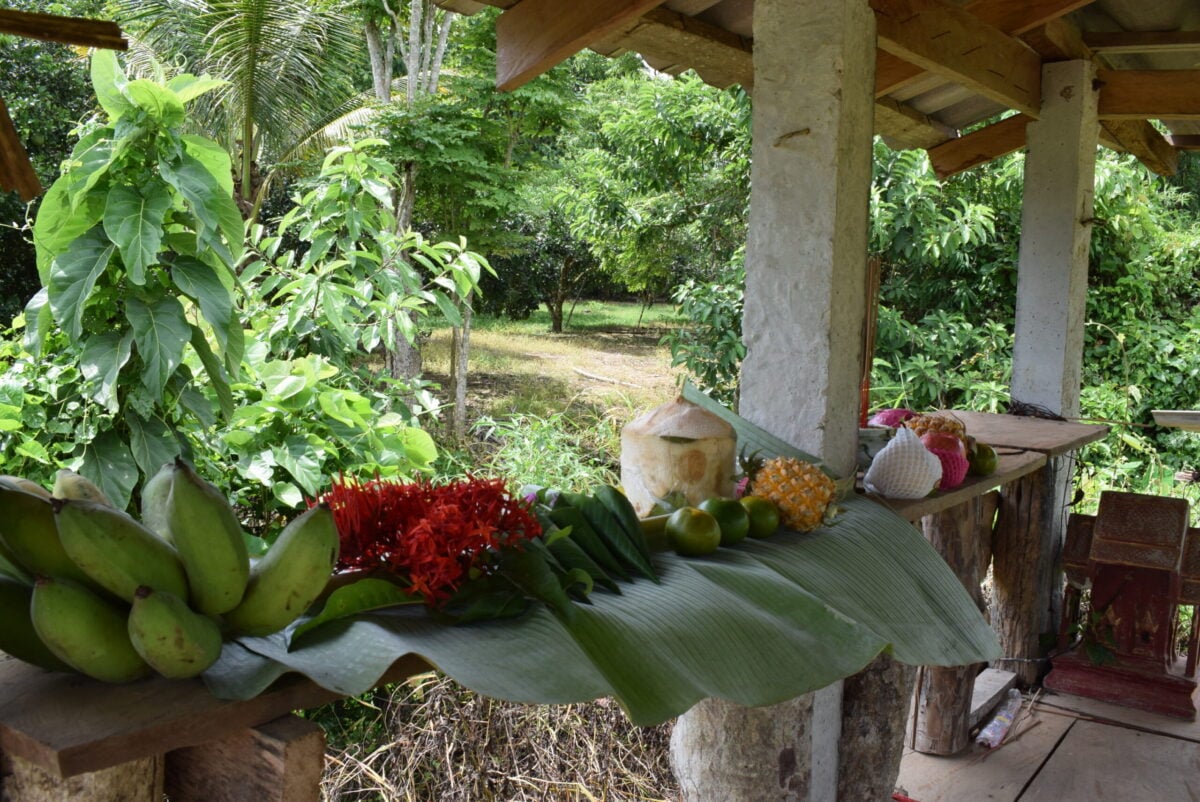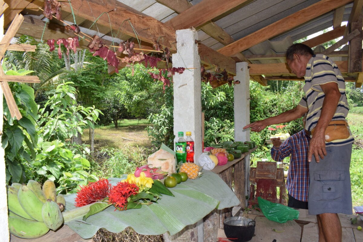 อดีตผู้ช่วยผู้ใหญ่บ้านหล่ายงาว กล่าวอีกว่า ของสำคัญที่ต้องนำมาเป็นเครื่องเซ่นไหว้คือ วัวหนังสีแดง 1 ตัว นำมาชำแหละฆ่าเพื่อแบ่งกันทั้ง 6 หมู่บ้านเท่าๆ กัน แล้วนำส่วนนั้นมาปรุงเป็นเครื่องเซ่นไหว้ เช่นนลาบดิบ,แกงอ่อมและเนื้อสด ส่วนผลไม้, ขนมของหวาน, สุรา,ผ้าขาว/แดง, หมากพลู, ยาสูบ ก็จะจัดใส่ถ้วยใบตองและสะตวงกาบกล้วย โดยนำสิ่งของทั้งหมดไปถวายเจ้าที่เจ้าป่าเจ้าเขาที่ห้างนา โดยมีปู่จารย์เป็นผู้กล่าวนำถวาย เสร็จสิ้นพิธีก็จะนำสิ่งของทั้งหมดมานั่งรับประทานในสถานที่จัดพิธี และจะไม่นำสิ่งของต่างๆกลับบ้านโดยเด็ดขาด เพราะอาจส่งผลร้ายตามมา (ตามคำบอกเล่าคนเฒ่าคนแก่)
