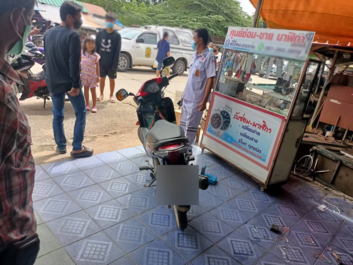 ลืมใส่เกียร์ว่าง! เผลอสตาร์ทรถ แถมบิดคันเร่งส่ง จยย.พุ่งชนร้านซ่อมนาฬิกาเสียหาย คนขี่ได้รับบาดเจ็บ