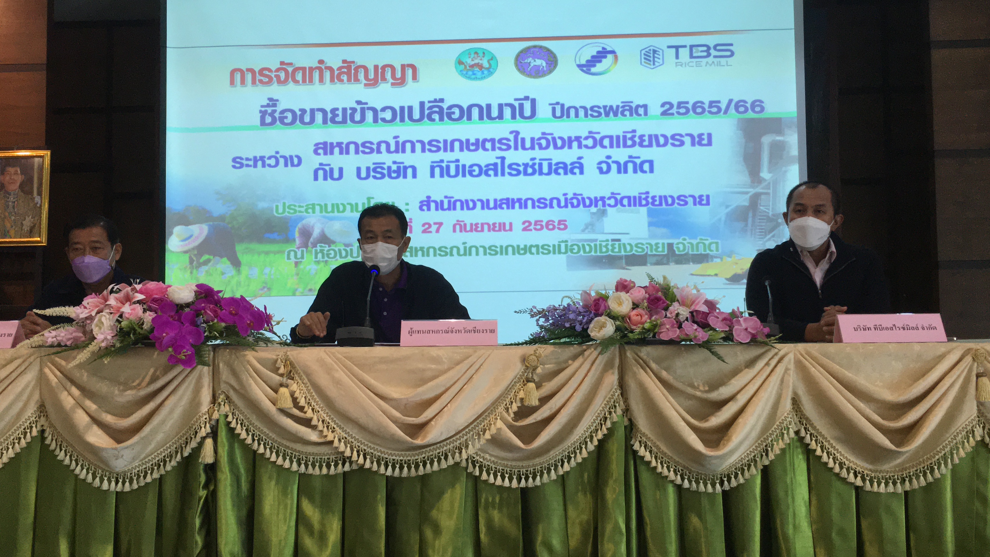 นายอาคม โยริยะ ผู้อำนวยการกลุ่มส่งเสริมและพัฒนาธุรกิจสหกรณ์ กล่าวว่า การรับซื้อข้าวเปลือกนาปีเป็นนโยบายของกรมส่งเสริมสหกรณ์และของจังหวัดเชียงรายอยู่แล้ว ในการให้สหกรณ์การเกษตรเข้ามามีบทบาทในการรับซื้อผลผลิตทางการเกษตรทุกชนิดโดยเฉพาะข้าวเปลือกทั้งนาปีและนาปรัง ซึ่งสหกรณ์ของเราก็มีบทบาทในการรวบรวมตั้งแต่ต้นน้ำยันปลายน้ำ ซึ่งในครั้งนี้เป็นการรวบรวมข้าวนาปังและนาปีในการทำสัญญากับบริษัทที่ส่งออกข้าวโดยตรง ซึ่งบริษัท ทีบีเอสไรซ์มิลล์ จำกัด ผู้ส่งออกข้าวยินดีเข้าร่วมโครงการเพื่อรับซื้อผลผลิต มีสหกรณ์การเกษตรในพื้นที่จังหวัดเชียงราย 9 แห่งที่จะทำการรวบรวมข้าวเปลือกของสมาชิกคาดว่าประมาณ 200,000 ตันมาจำหน่ายให้กับบริษัท ทีบีเอสไรซ์มิลล์ จำกัด จากจำนวนผลผลิตทั้งจังหวัด 700,000 ตัน ซึ่งจะสามารถช่วยเกษตรกรได้ส่วนหนึ่งโดยเฉพาะสมาชิกของสหกรณ์ สำหรับสหกรณ์ที่ร่วมทำสัญญาซื้อขายข้าวเลือกในครั้งนี้จำนวน 9 สหกรณ์ ประกอบด้วย สหกรณ์การเกษตรเมืองเชียงราย จํากัด สหกรณ์การเกษตรเวียงชัย จํากัด สหกรณ์การเกษตรเมืองพาน จํากัดสหกรณ์การเกษตรเชียงแสน จํากัด สหกรณ์การเกษตรพญาเม็งราย จํากัด สหกรณ์ การเกษตรแม่สรวย จํากัด สหกรณ์การเกษตรแม่จัน จํากัด สหกรณ์การเกษตรหงาว ตับเต่า จํากัด ชุมนุมสหกรณ์จังหวัดเชียงราย โดยจะเริ่มเปิดรับซื้อผลผลิตข้าวจากเกษตรตั้งแต่วันที่ 28 กันยายน 2565 เป็นต้นไป