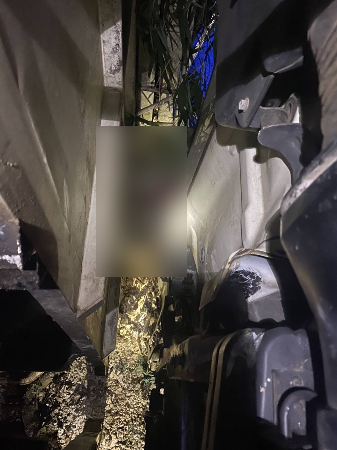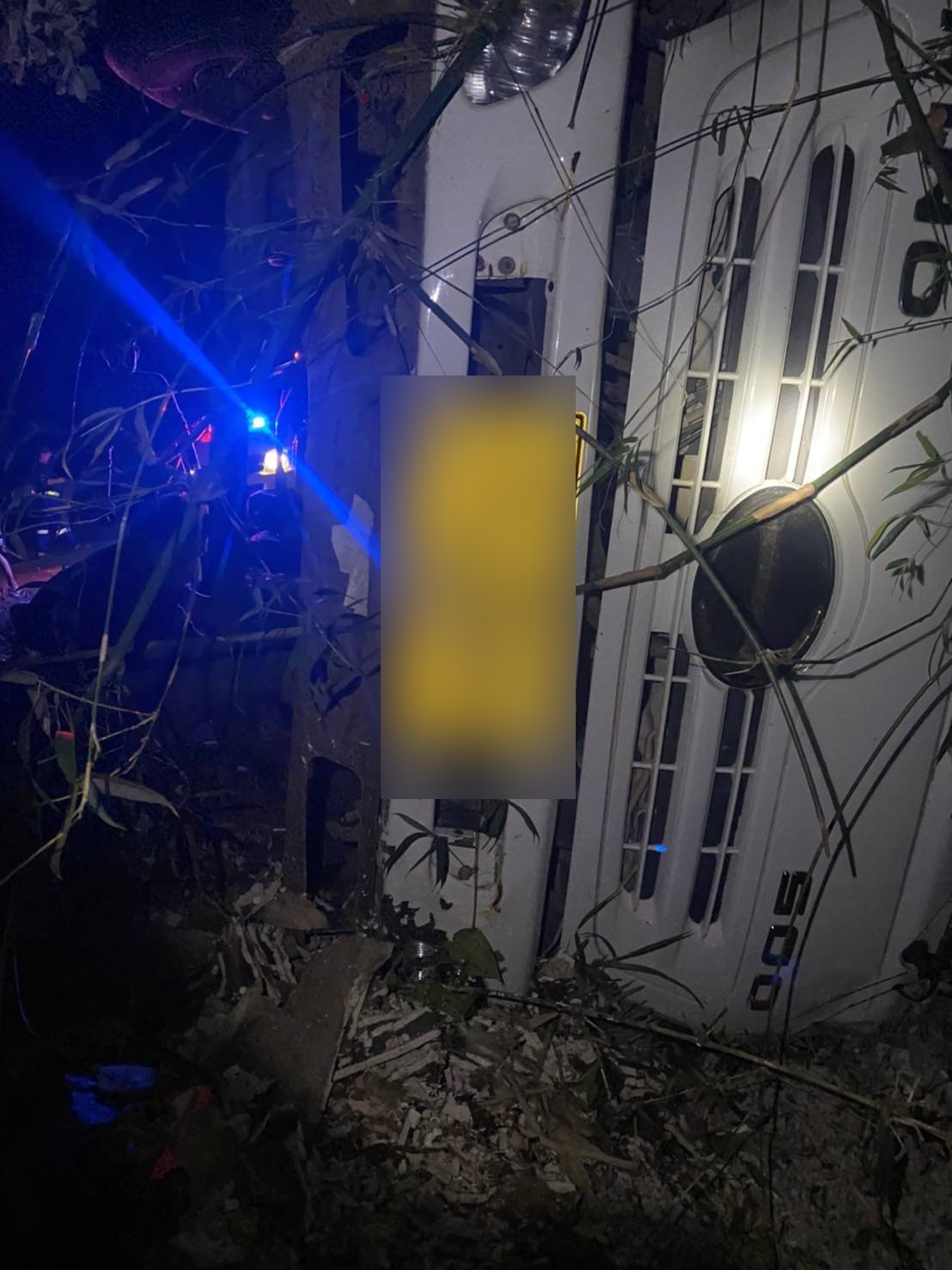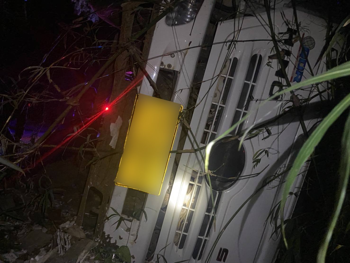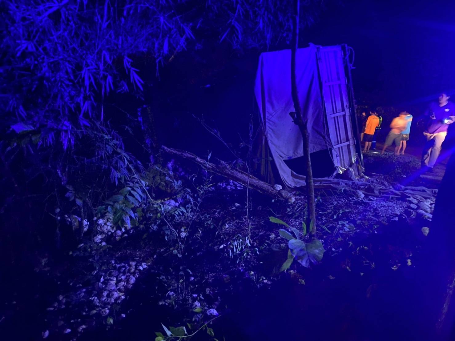 ที่เกิดเหตุอยู่บนถนนทางหลวงหมายเลข 1155 ถนนฝั่งมุ่งหน้าไปทาง อ.เทิง จ.เชียงราย พบรถบรรทุกหกล้อยี่ห้อฮีโน่ สีขาว ทะเบียน พะเยา พลิกตะแคงข้างซ้ายอยู่ริมถนน รถเกือบพุ่งตกเขา แต่ไปค้างอยู่กับกอไผ่ข้างทาง ตรวจสอบพบขี้ยางพาราที่บรรทุกมาตกเกลื่อนริมถนน ในห้องโดยสารพบผู้ขับขี่คือนายแก้ว (สงวนนามสกุล) อายุ 49 ปี ชาวบ้าน ต.ทุ่งกล้วย อ.ภูซาง จ.พะเยา มีอาการเจ็บหน้าอก และมีศพผู้โดยสารข้างคนขับพุ่งทะลุกระจกและโดนประตูรถทับไว้อยู่ เจ้าหน้าที่กู้ภัยต้องใช้อุปกรณ์ตัดถ่างนำร่างผู้เสียชีวิตออกมาจากรถ ทราบชื่อภายหลังคือนายสุนี (สงวนนามสกุล) อายุ 23 ปี สัญชาติลาว ชาวบ้านใหญ่นารา แขวงไชยะบุรี สปป.ลาว เสียชีวิตในที่เกิดเหตุ แพทย์และกู้ภัยนำส่งผู้บาดเจ็บและเสียชีวิตส่ง รพ.เวียงแก่น