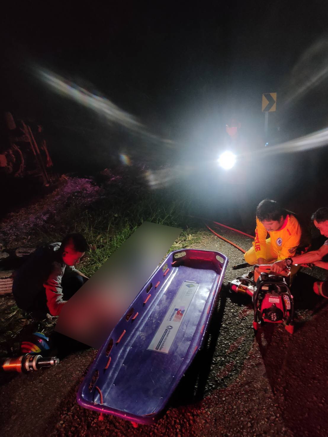 รถหกล้อบรรทุกขี้ยาง เบรคแตกเสียหลักล้มบนดอยเวียงแก่น ดับ 1 เจ็บ 1