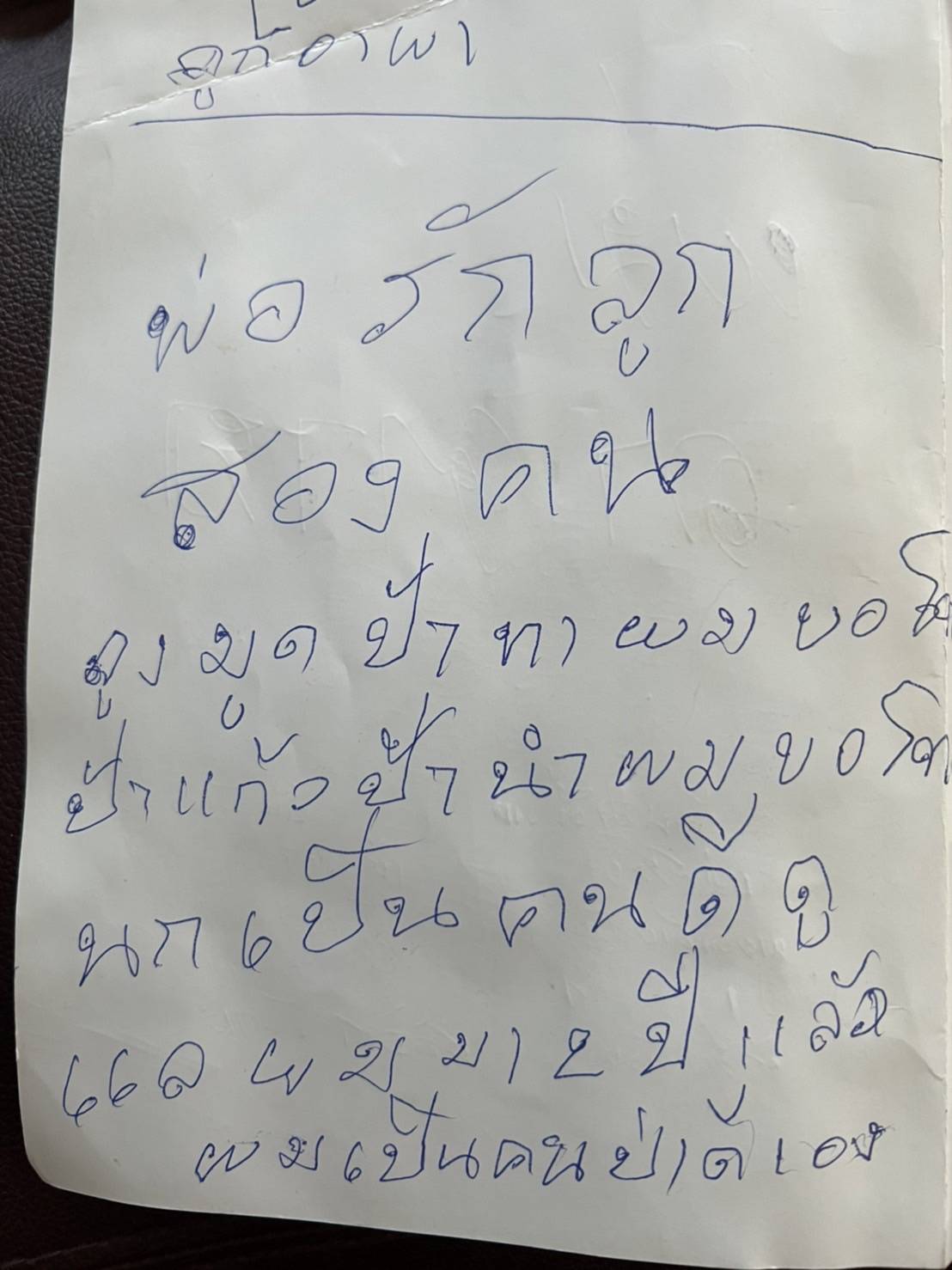 และจากการค้นที่บ้านของผู้ตาย ก็พบกับสมุดเล่มหนึ่ง บนหน้าปกเขียนด้วยปากกว่า “คำผมลาตาย” และที่ปกด้านในเขียนคำว่า “ผมลาตาย” และ “พ่อรักลูกทั้ง 2 คน” โดยภายในสมุดเกือบ 30 หน้า เต็มไปด้วยคำขอโทษลูกเมีย พระครูบา หลวงพี่นัท และคนที่รู้จัก ที่ตัดสินใจทำแบบนี้เพราะไม่อยากเป็นภาระใคร