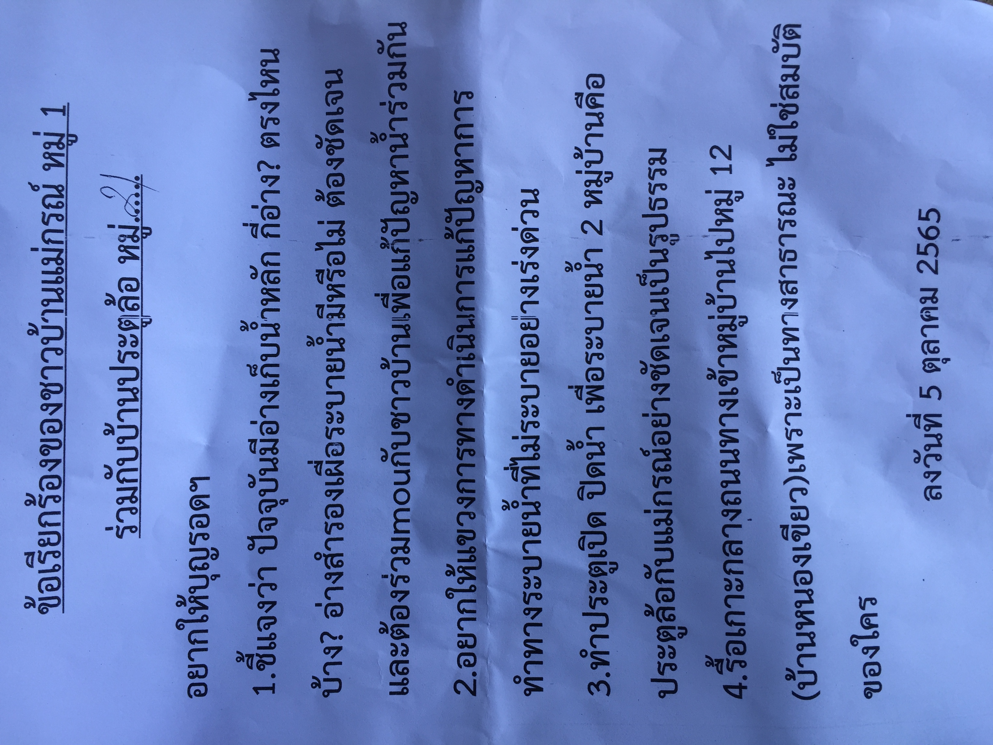 วันที่ 6 ต.ค. 65 ที่สถานีตำรวจขุนกรณ์ ตำบล แม่กรณ์ อ.เมือง จ.เชียงราย ชาวบ้านหมู่บ้านประตูล้อ หมู่ 21 ต.ป่าอ้อดอนชัย อ.เมืองเชียงราย จ.เชียงราย และ ชาวบ้านแม่กรณ์ ม.1 ต.แม่กรณ์ อ.เมือง จ.เชียงราย กว่า 30 คน นำโดยนางจินดา อินทรรักษาทรัพย์ ผู้ใหญ่บ้านประตูล้อ ม.21 และ น.ส.จิรนันท์ จันทวงษ์ ชาวบ้านบ้านแม่กรณ์ ได้รวมตัวกันเพื่อยื่นหนังสือข้อเรียกร้องหลังจากชาวบ้าน 2 หมู่บ้านดังกล่าวต้องประสบปัญหาน้ำท่วมชุมชน (รอระบาย) เมื่อมีฝนตกหนัก
