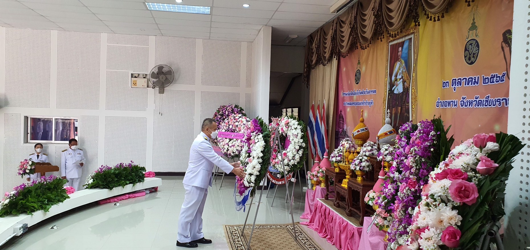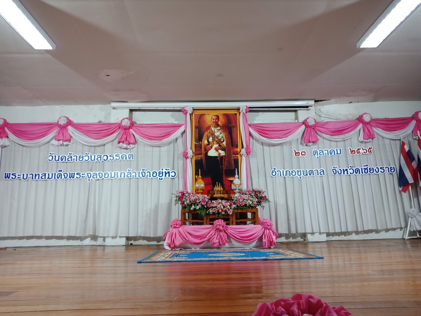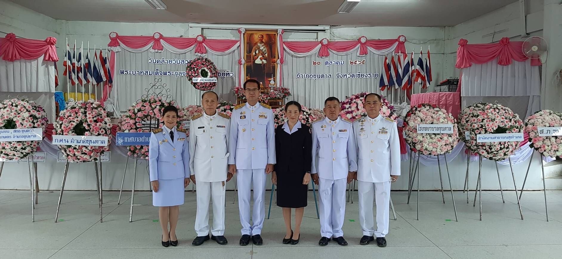 อำเภอขุนตาล-วันที่ 23 ตุลาคม 2565 เวลา 08.30 น. นายอดิเรก ไลไธสง นายอำเภอขุนตาล นางสุพิชา ไลไธสง นายกกิ่งกาชาดอำเภอขุนตาลพร้อมด้วย หัวหน้าส่วนราชการ หัวหน้าหน่วยงานรัฐวิสาหกิจ ผู้บริหารสถานศึกษา องค์กรปกครองส่วนท้องถิ่น กำนันผู้ใหญ่บ้าน สมาชิกกิ่งกาชาด ร่วมถวายพวงมาลา เบื้องหน้าพระบรมฉายาลักษณ์พระบาทสมเด็จพระจุลจอมเกล้าเจ้าอยู่หัว ในพิธีน้อมรำลึก เนื่องในวันคล้ายวันสวรรคต พระบาทสมเด็จพระจุลจอมเกล้าเจ้าอยู่หัว ณ หอประชุมที่ว่าการอำเภอขุนตาล จังหวัดเชียงราย