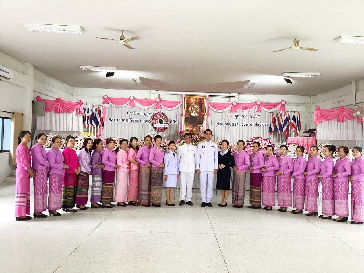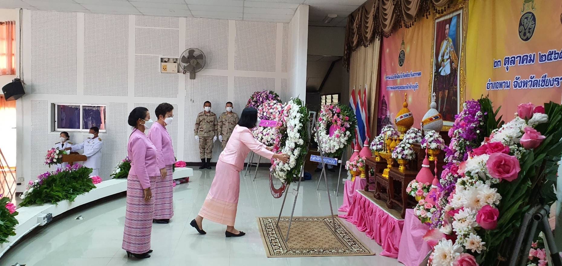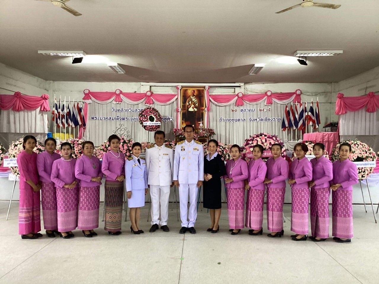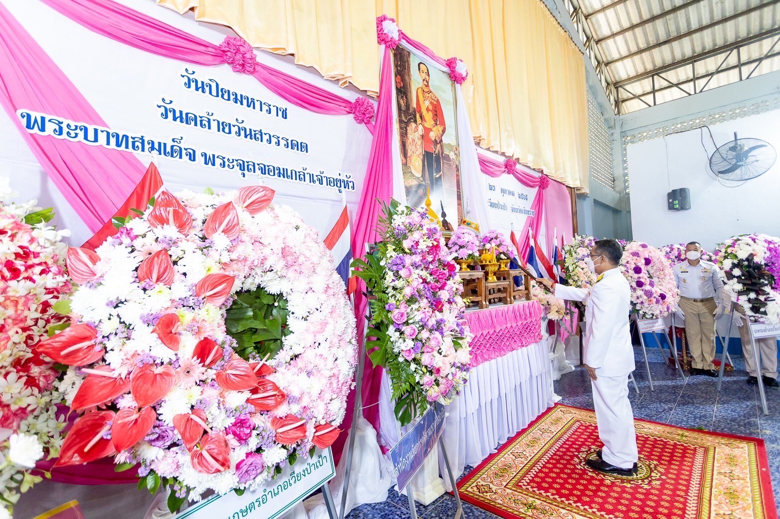 อำเภอขุนตาล-วันที่ 23 ตุลาคม 2565 เวลา 08.30 น. นายอดิเรก ไลไธสง นายอำเภอขุนตาล นางสุพิชา ไลไธสง นายกกิ่งกาชาดอำเภอขุนตาลพร้อมด้วย หัวหน้าส่วนราชการ หัวหน้าหน่วยงานรัฐวิสาหกิจ ผู้บริหารสถานศึกษา องค์กรปกครองส่วนท้องถิ่น กำนันผู้ใหญ่บ้าน สมาชิกกิ่งกาชาด ร่วมถวายพวงมาลา เบื้องหน้าพระบรมฉายาลักษณ์พระบาทสมเด็จพระจุลจอมเกล้าเจ้าอยู่หัว ในพิธีน้อมรำลึก เนื่องในวันคล้ายวันสวรรคต พระบาทสมเด็จพระจุลจอมเกล้าเจ้าอยู่หัว ณ หอประชุมที่ว่าการอำเภอขุนตาล จังหวัดเชียงราย