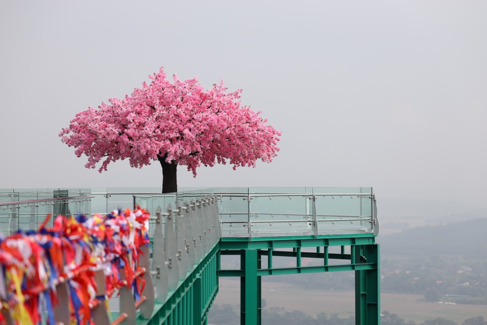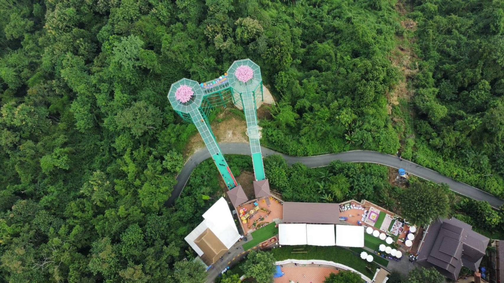 ซึ่งมีลักษณะเป็นสะพานกระจกสัณฐานรูปแปดเหลี่ยม มีเส้นผ่าศูนย์กลาง 12 เมตร สูงจากพื้นดิน 25 เมตร มีทางเดินเชื่อมกัน กว้าง 3.85 เมตร ยาว 9.9 เมตร มีทางเข้า และออกต่อเชื่อมกับถนนรอบพระบรมธาตุพุทธนิมิตเจดีย์ โดยเป็นกระจก และโลหะความยาวด้านละ 35 เมตร จำนวน 2 ด้าน รวม 70 เมตร ความกว้าง 3 เมตร ประกอบเป็นพื้นที่สกายวอล์ค รวมกันทั้งสิ้น 460 ตารางเมตร ซึ่งมีโครงสร้างเป็นโลหะสูง 25 ชั้น ทาสีเขียวเข้มเข้ากับธรรมชาติ และตั้งอยู่บนดอยจันที่สูงจากระดับน้ำทะเลปานกลางประมาณ 486 เมตร วัสดุพื้นเป็นกระจกนิรภัยลามิเนต 3 ชั้นความหนารวม 48 มิลลิเมตร วัสดุผนังกั้นตกเป็นกระจกนิรภัยลามิเนตสองชั้นความหนา 20 มิลลิเมตร กระจกทั้งสองรายการได้ผ่านการทดสอบว่าได้คุณภาพตามที่กำหนด