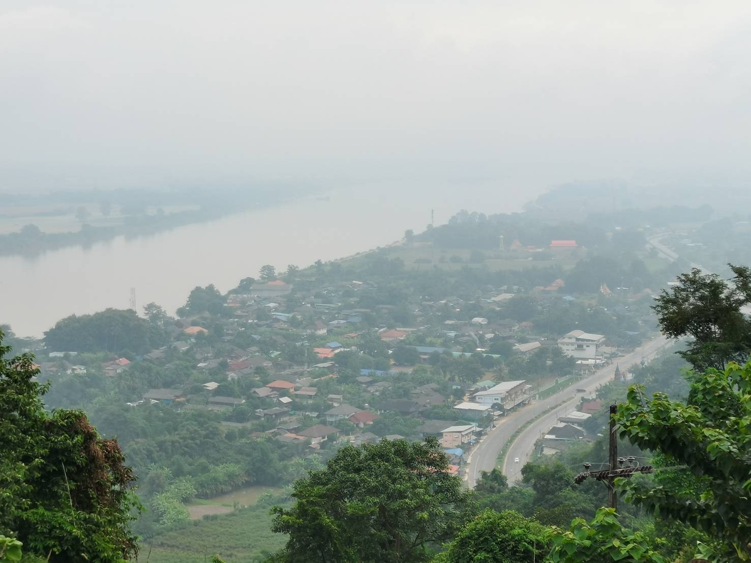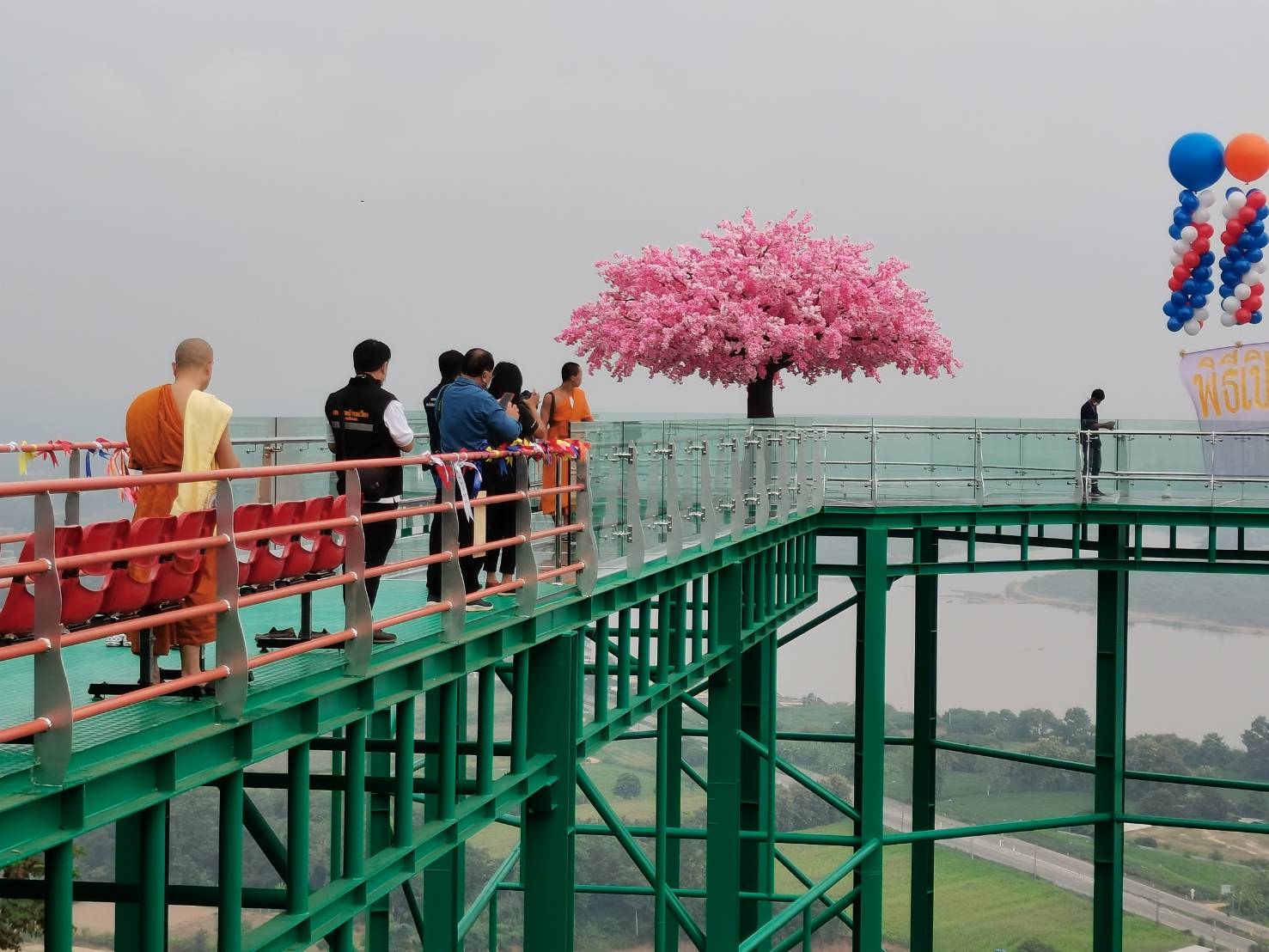ซึ่งเป็นสกายวอล์คที่หันหน้าไปทางทิศเหนือห่างจากแม่น้ำโขงประมาณ 400 เมตรขนานไปกับถนนสายเชียงแสน เชียงของสามารถ มองเห็นวิวทิวทัศน์ริมน้ำโขงฝั่งไทยและบ้านดอนสวรรค์เมืองต้นผึ้งแขวงบ่อแก้ว สปป. ลาวรวมถึงทัศนียภาพที่อยู่ในสปปลาวตลอดจนเขตเศรษฐกิจพิเศษสามเหลี่ยมทองคำและประเทศเมียนมาร ซึ่งมีลักษณะเป็นสะพานกระจกสัณฐานรูปแปดเหลี่ยมมีเส้นผ่านศูนย์กลาง 12 เมตรสูงจากพื้นดิน 25 เมตรมีทางเดินเชื่อมกันกว้าง 3.85 เมตรยาว 9.9 เมตรมีทางเข้าและออกต่อเชื่อมกันกับถนนรอบพระบรมธาตุพุทธนิมิตรเจดีย์โดยเป็นกระจกและโลหะความยาวด้านละ 35 เมตรจำนวน 2 ด้านรวม 70 เมตรความกว้าง 3 เมตรประกอบเป็นพื้นที่สกายวอล์ครวมทั้งสิ้น 460 ตารางเมตร