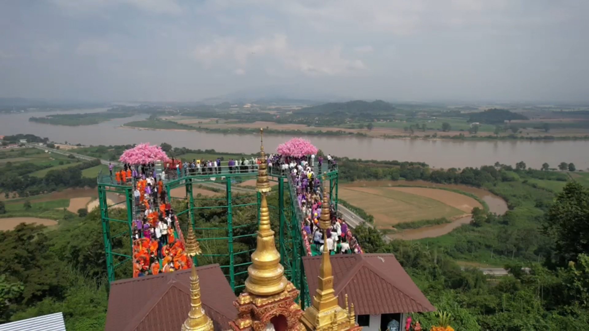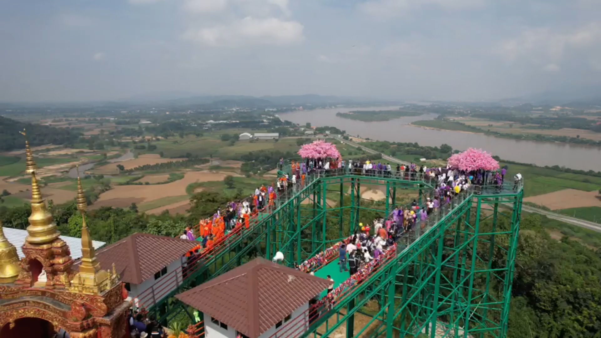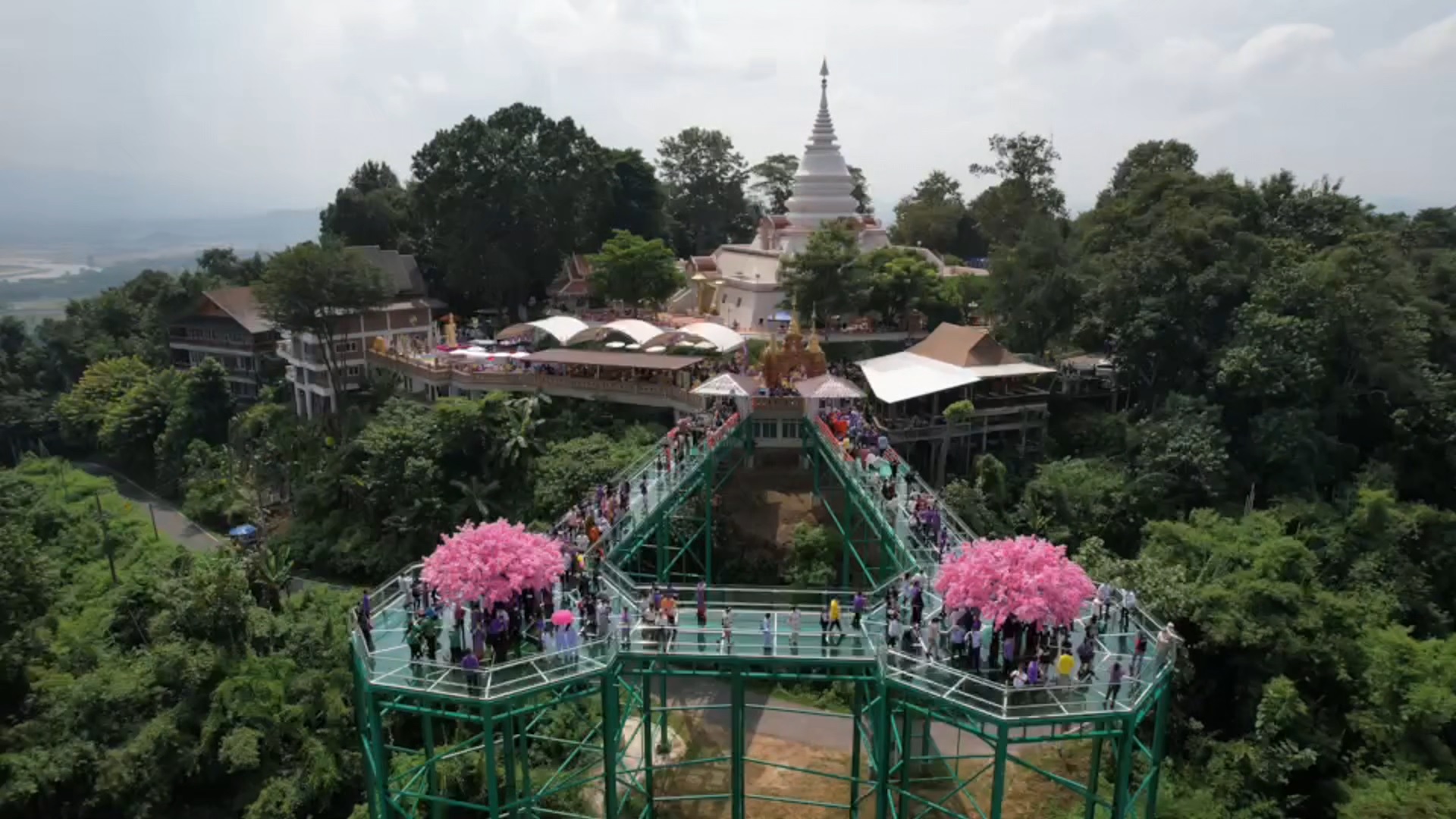 นอกจากนี้ สถานที่ท่องเที่ยวที่เพิ่งเปิดตัวไปเมื่อไม่กี่วันที่ผ่านมา อย่างสกายวอล์คผาเงา ที่วัดพระธาตุผาเงา ต.เวียง อ.เชียงแสน ซึ่งเป็นสกายวอล์คที่หันหน้าไปทางทิศเหนือ ห่างจากแม่น้ำโขงประมาณ 400 เมตร ขนานไปกับถนนสายเชียงแสน-เชียงของ สามารถเห็นทิวทัศน์ริมน้ำโขงฝั่งไทย และบ้านดอนสะหวัน เมืองต้นผึ้ง แขวงบ่อแก้ว สปป.ลาว รวมถึงทัศนียภาพที่อยู่ใน สปป.ลาว ตลอดจนเขตเศรษฐกิจพิเศษสามเหลี่ยมทองคำ และประเทศเมียนมา ซึ่งมีลักษณะเป็นสะพานกระจกสัณฐานรูปแปดเหลี่ยม มีเส้นผ่าศูนย์กลาง 12 เมตร สูงจากพื้นดิน 25 เมตร มีทางเดินเชื่อมกัน กว้าง 3.85 เมตร ยาว 9.9 เมตร มีโครงสร้างเป็นโลหะสูง 25 ชั้น ตั้งอยู่บนดอยจันที่สูงจากระดับน้ำทะเลปานกลาง ประมาณ 486 เมตร โดยทาง วัดพระธาตุผาเงาได้ร่วมกับบริษัทเอกชน และชุมชนจัดวางระบบ เปิดให้นักท่องเที่ยว จะปิดเส้นทางขึ้นลงจากลานจอดรถตรงพระอุโบสถของวัด ไปจนถึงพระบรมธาตุพุทธนิมิตเจดีย์ โดยใช้การจัดรถรับส่งแทนคิดราคาค่าโดยสารคนละ 30 บาท และมีค่าเข้าชมสกายวอล์คคนละ 40 บาท พร้อมมีศาลาที่พักสำหรับนักท่องเที่ยว โดยกำหนดจำนวนให้ผู้เข้าชมบนสกายวอล์ค เบื้องต้นได้ครั้งละ 100 คน เปิดตั้งแต่เวลา 07.30 น. จนถึงเวลา 18.00 น.