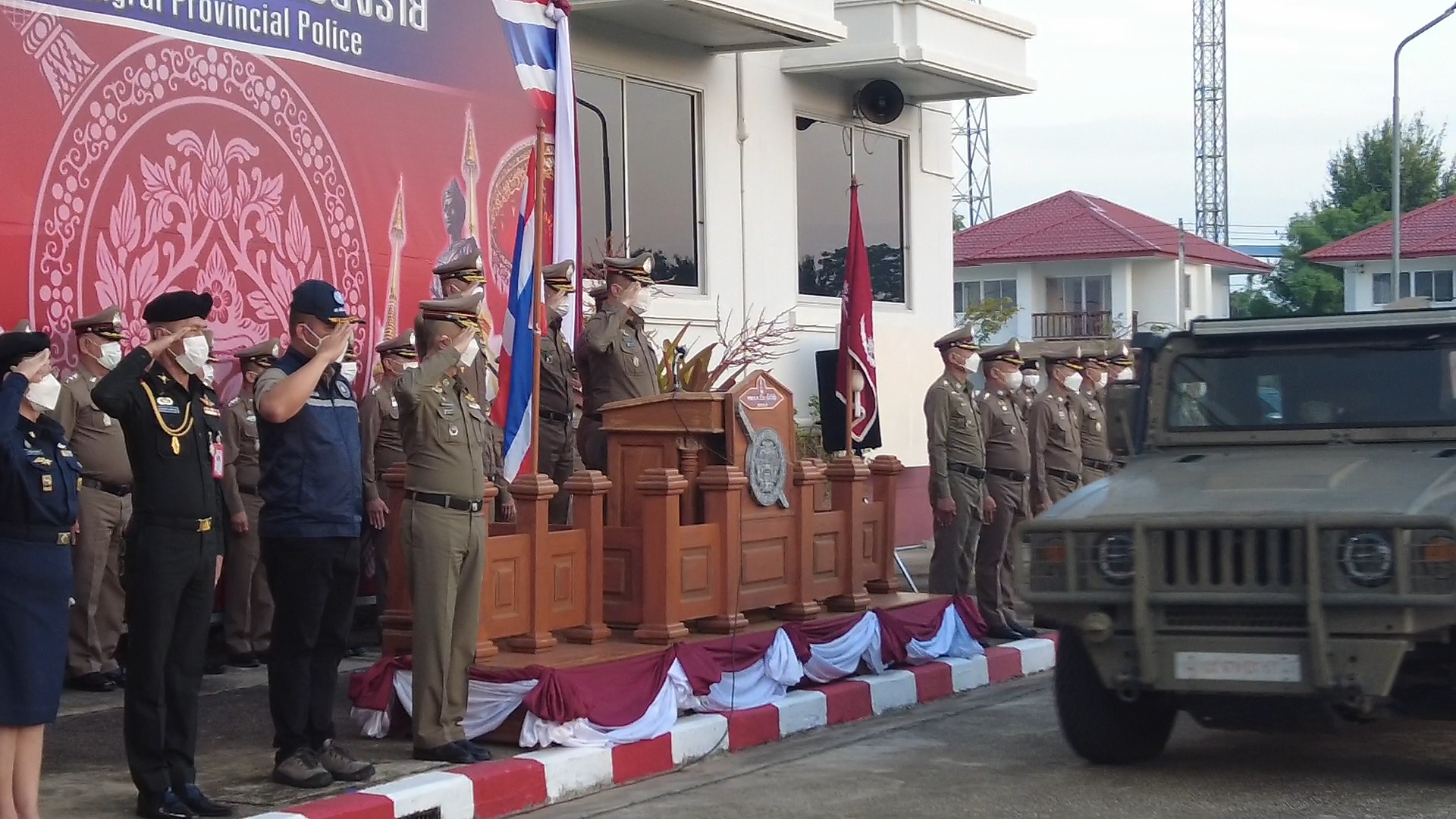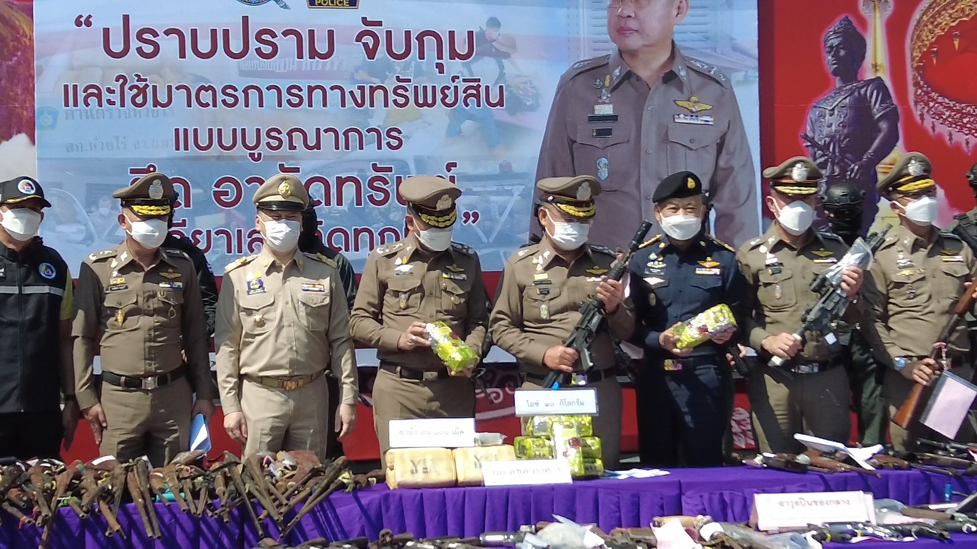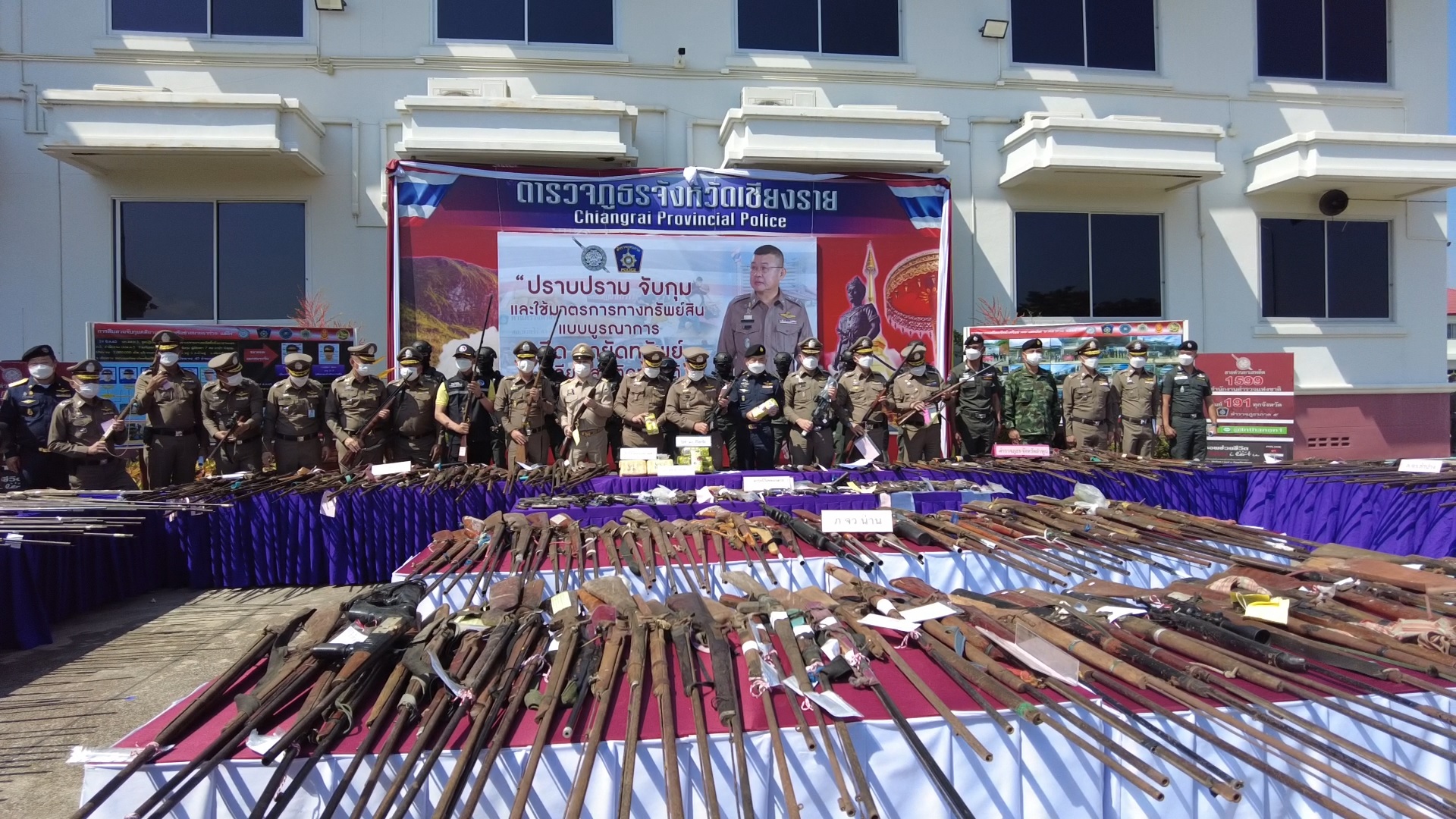 วันที่ 30 ตุลาคม 2565 ที่กองบังคับการตำรวจภูธรจังหวัดเชียงราย พล.ต.อ.ดำรงศักดิ์ กิตติประภัสร์ ผบ.ตร., นายวิชัย ไชยมงคล เลขาธิการ ป.ป.ส., พล.ต.อ.ชินภัทร สารสิน รอง ผบ.ตร., พล.ต.อ.ต่อศักดิ์ สุข วิมล รอง ผบ.ตร. พล.ต.ท.ปิยะ ต๊ะวิชัย ผบช.ภ.5 ,พล.ต.ต.ดุลเดชา อาชวะสมิตระกูล ผบก.ภ.จว.เชียงราย พร้อมด้วย เจ้าหน้าที่ กองกำลังผาเมือง ฝ่ายปกครอง และหน่วยงานที่เกี่ยว ได้ร่วมกันแถลงข่าวการปฏิบัติการกวาดล้างอาชญากรรม อาวุธปืน ยาเสพติด และสิ่งผิดกฎหมาย