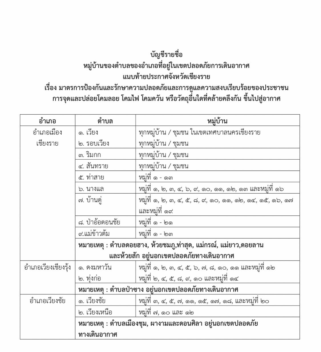 สำหรับพื้นที่ห้ามปลอยโคมลอย โคมไฟ โคมควัน หรือวัตถุที่คล้ายคลึงกัน ขึ้นไปสู่อากาศ ประกอบด้วย