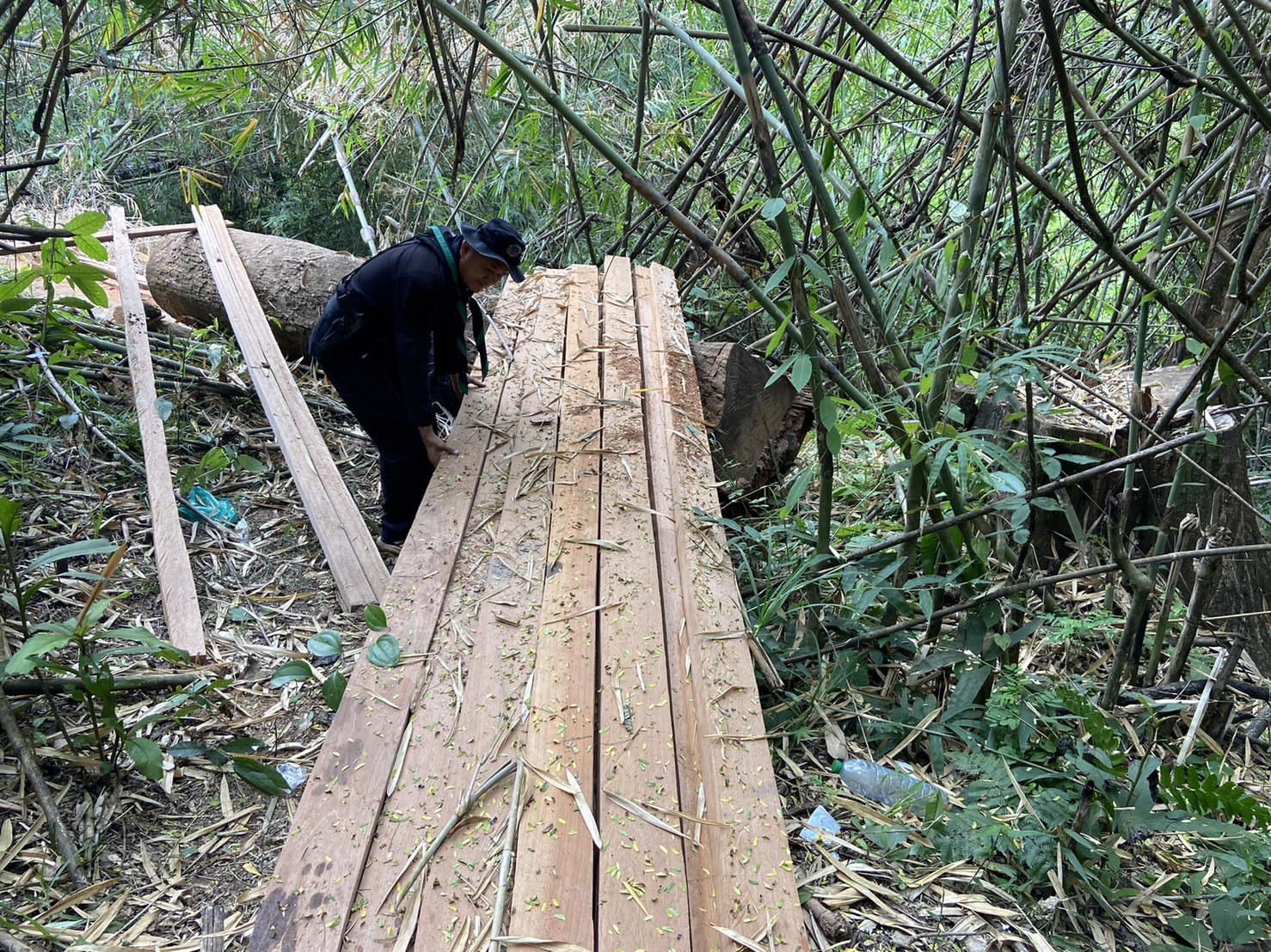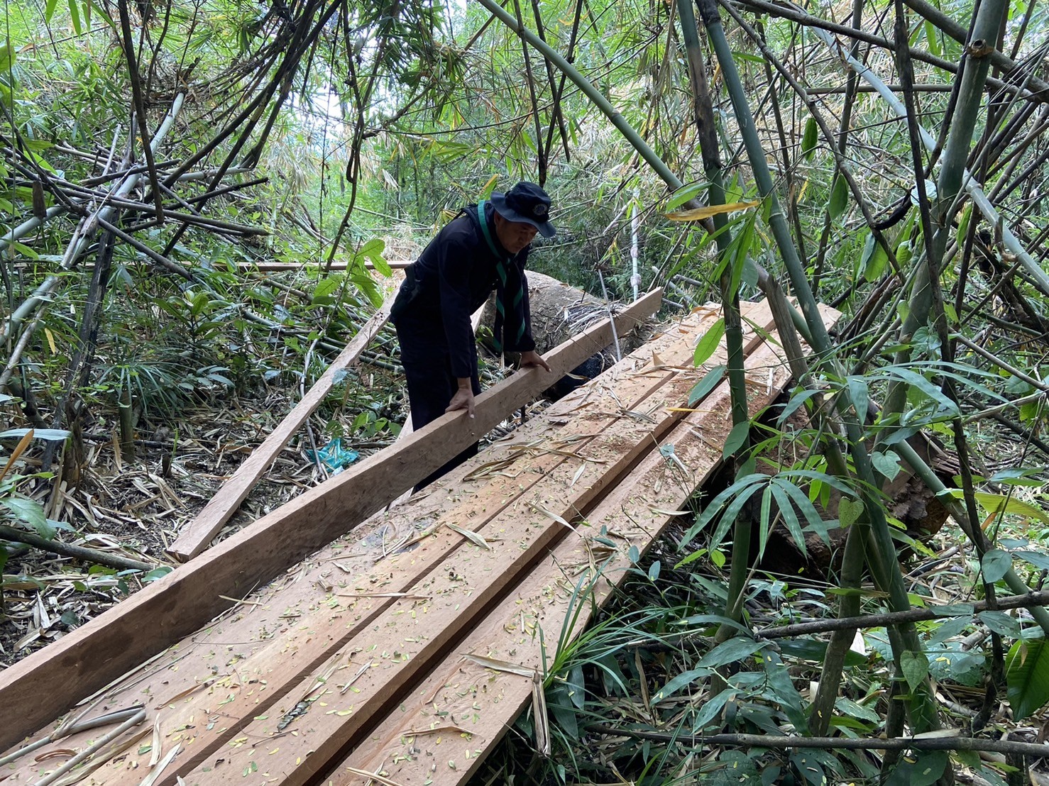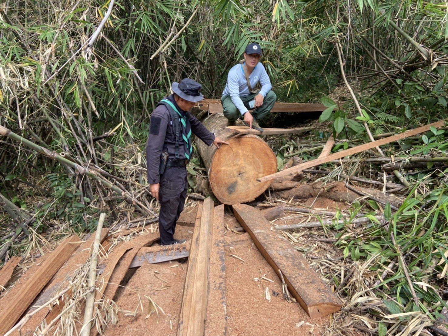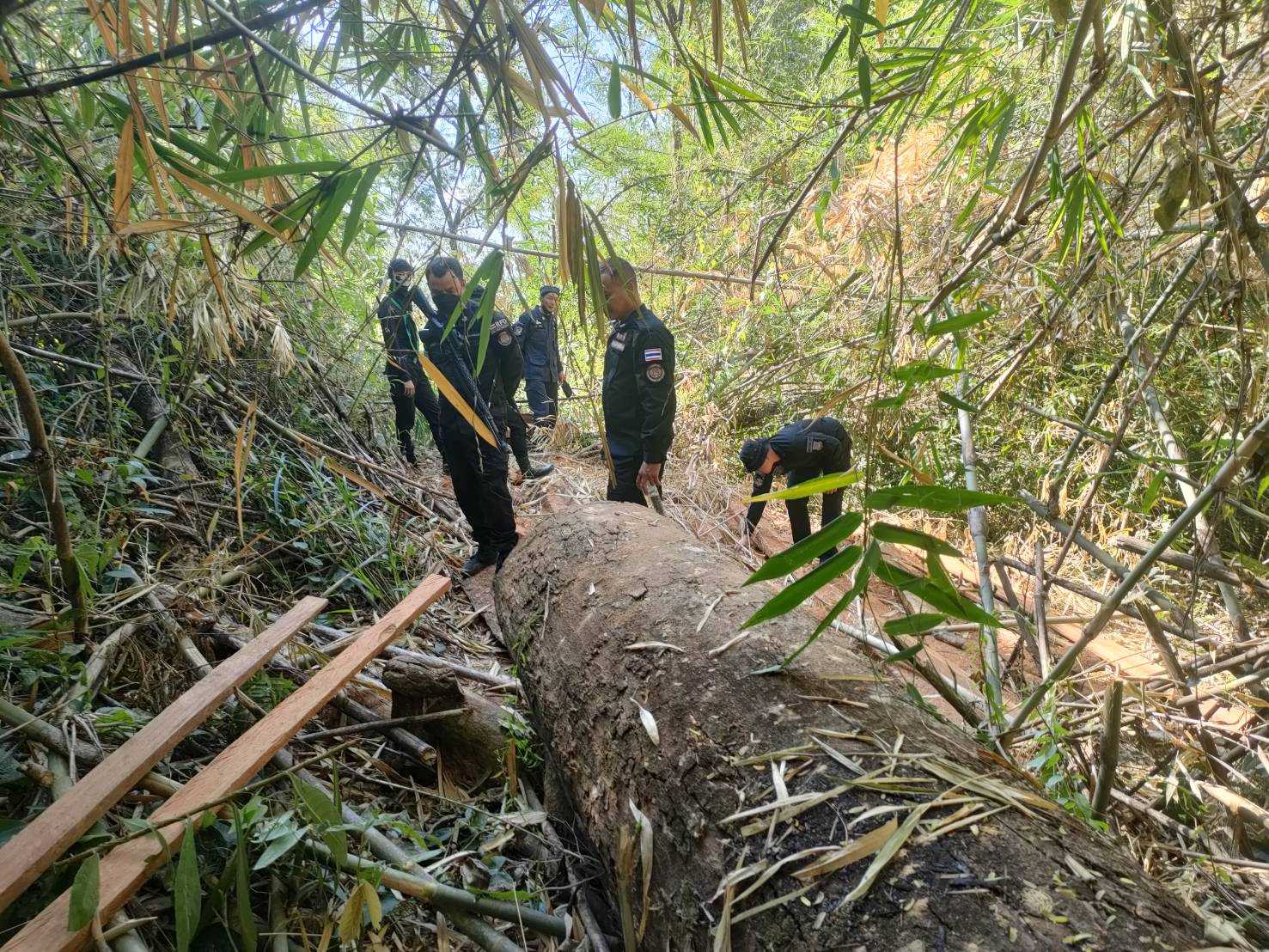 ต่อมาเจ้าหน้าที่ได้ตรวจพบไม้ตะเคียน จำนวน 1 ท่อน เส้นฝ่าศูนย์กลาง 71 เซนติเมตร, ไม้ตะเคียนแปรรูป ขนาดหน้ากว้าง 5 นิ้ว หนา 2 นิ้ว ยาว 5 เมตร จำนวน 10 แผ่น/เหลี่ยม และไม้ยางแปรรูป ขนาดหน้ากว้าง 3 นิ้ว หนา 2 นิ้ว ยาว 5 เมตร จำนวน 20 แผ่น/เหลี่ยม ซุกซ่อนอยู่ในบริเวณดังกล่าว รวมปริมาตรทั้งสิ้น 0.60 ลูกบาศก์เมตร มูลค่าความเสียหาย เป็นจำนวนเงิน 6,000 บาท หน่วยจึงได้นำของกลางดังกล่าวส่งให้กับเจ้าหน้าที่หน่วยป้องกันและพัฒนารักษาป่าเทิงทำการตรวจสอบบริเวณพื้นที่การลักลอบตัดไม้ เพื่อเก็บไว้เป็นหลักฐาน และดำเนินการตามกฎหมายต่อไป