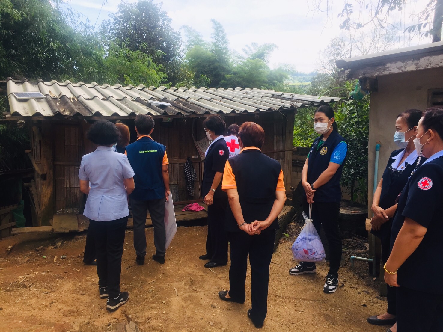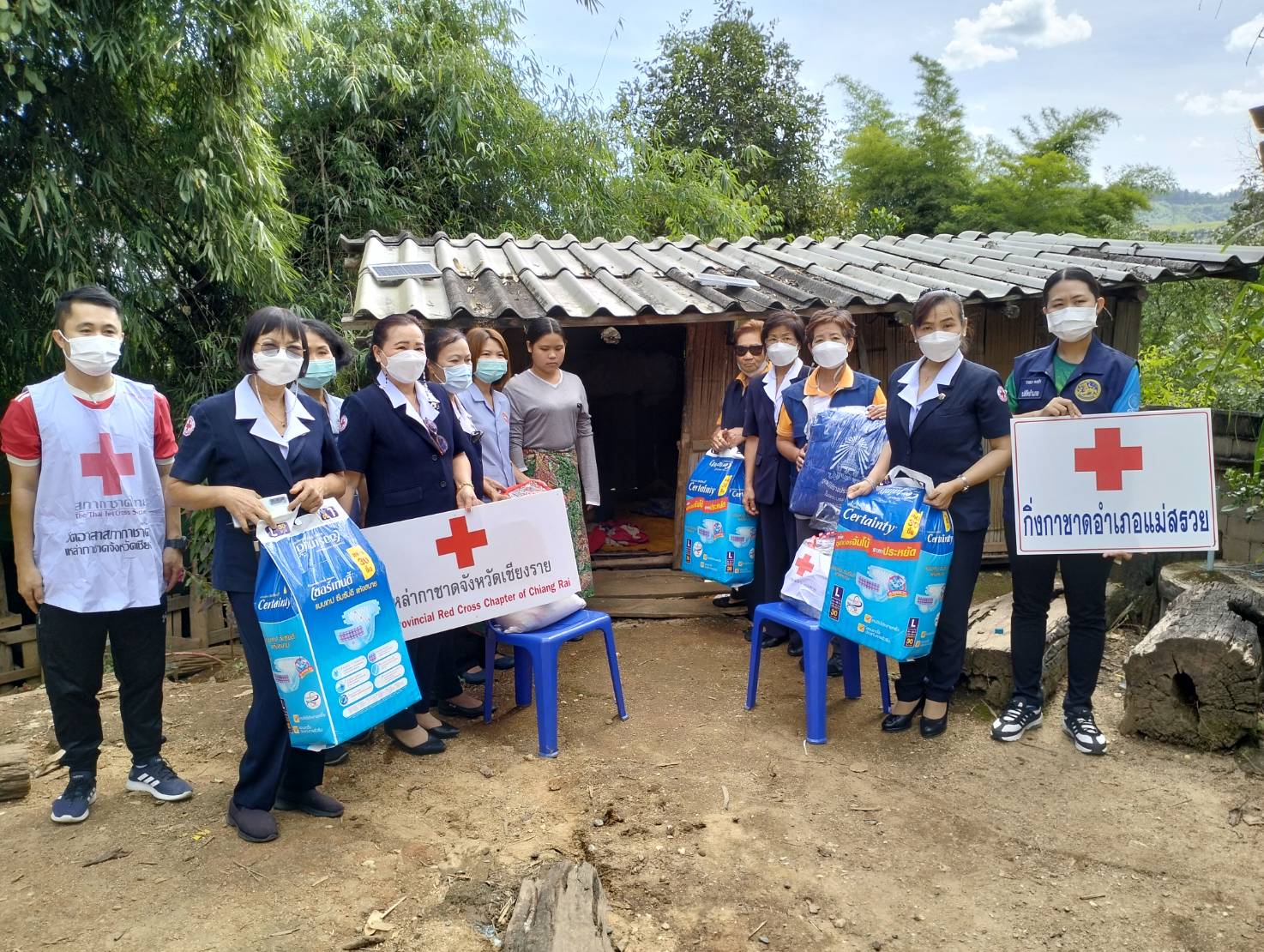 โดยกิ่งกาชาดอำเภอแม่สรวยได้มอบถุงยังชีพ ผ้าห่ม เพื่อเป็นขวัญและกำลังใจในการดำรงชีวิตต่อไป