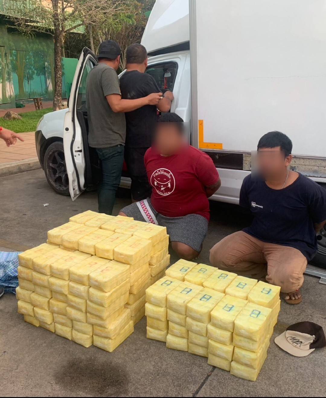 ต่อมา เมื่อ เวลา 17.15 น. 3 ธ.ค.65 เจ้าหน้าที่ได้พบรถยนต์เป้าหมายคันดังกล่าว บริเวณ ถนนเลี่ยงเมืองเชียงรายตะวันตก อ.เมืองเชียงราย เมื่อรถยนต์คันดังกล่าวเห็นเจ้าหน้าที่จึงได้ขับหลบหนี เจ้าหน้าที่จึงได้ทำการไล่ติดตาม พร้อมกับประสาน เจ้าหน้าที่ตำรวจในพื้นที่ช่วยสกัดจับ จนสามารถสกัดจับได้บริเวณปั้มน้ำมัน ปตท. เส้นทาง อ.พาน จ.เชียงราย จากการตรวจค้น สามารถจับกุมผู้ต้องหาได้จำนวน 2 คน คือ 1.นายชนินทร์ (สงวนนามสกุล) อายุ 28 ปี ชาว ต.วังโรงใหญ่ อ.สี่คิ้ว จ.นครราชสีมา 2.นายนนทวัฒน์ (สงวนนามสกุล) อายุ 23 ปี ชาว ต.หนองเม็ก อ.หนองสองห้อง จ.ขอนแก่น พร้อมของกลางยาเสพติดให้โทษประเภท 1 (ยาบ้า) จำนวน 7 กระสอบๆละ 200,000 เม็ด รวมยาบ้า จำนวนทั้งสิ้น 1,400,000 เม็ด ซุกซ่อนอยู่ในช่องดัดแปลงใต้ตู้ทึบท้ายกระบะ ทางเจ้าหน้าที่จึงได้ทำการควบคุมตัวทั้ง 2คน พร้อมของกลางเอาไว้เพื่อขยายผล